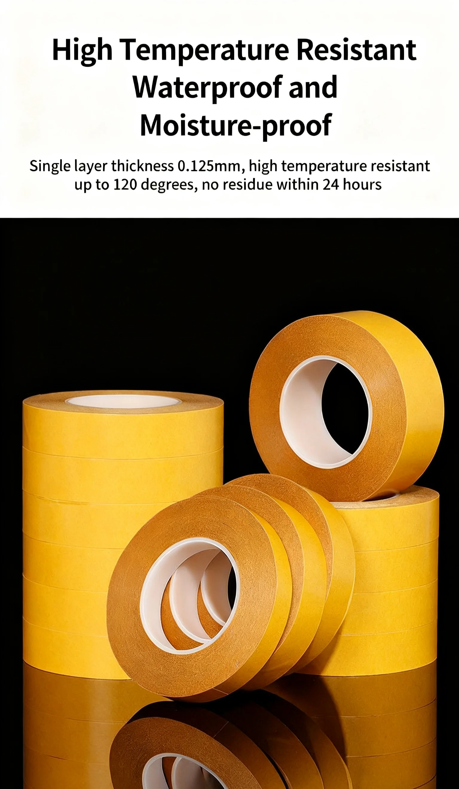 1. High-temperature resistance and strong adhesion: It can withstand temperatures up to 120℃, making it suitable for high-temperature environments (such as electronic components, automotive interiors, and LED light fixation), without melting or deforming. The strong adhesive back design ensures long-lasting adhesion and adheres firmly to various materials such as metal, plastic and glass without falling off.
