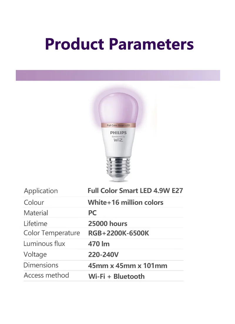 Philips 4PCS LED Smart Mini Ball E27 Bulbs WiZ 4.9W P45 Wi-Fi & Bluetooth 220-240V Full Color Light Frosted Dimmable P Lamps