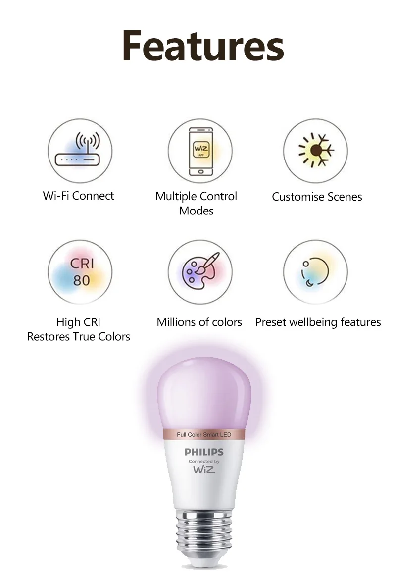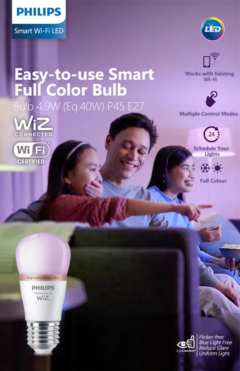 Use colourful shades of light in your interior spaces with the Philips smart LED full-colour smart bulb with an E27 base. This bulb is WiZ-connected. Use with your existing Wi-Fi to control with the WiZ app or your voice.