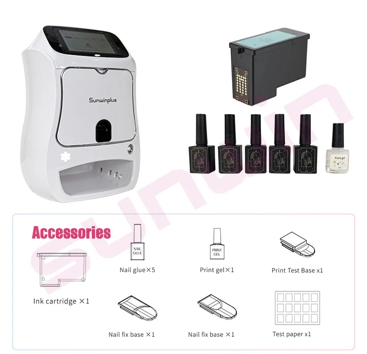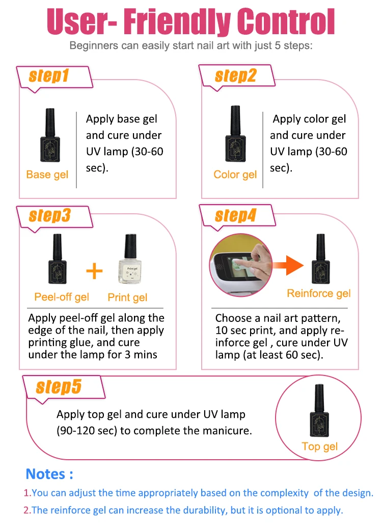 A. Inkjet Printing Technology: Utilizes advanced inkjet printing technology, equipped with a built-in camera and AI algorithm for precise nail positioning, ensuring accurate printing of desired patterns onto the nails.