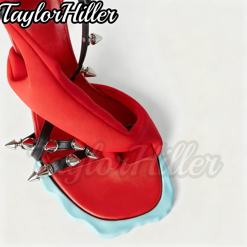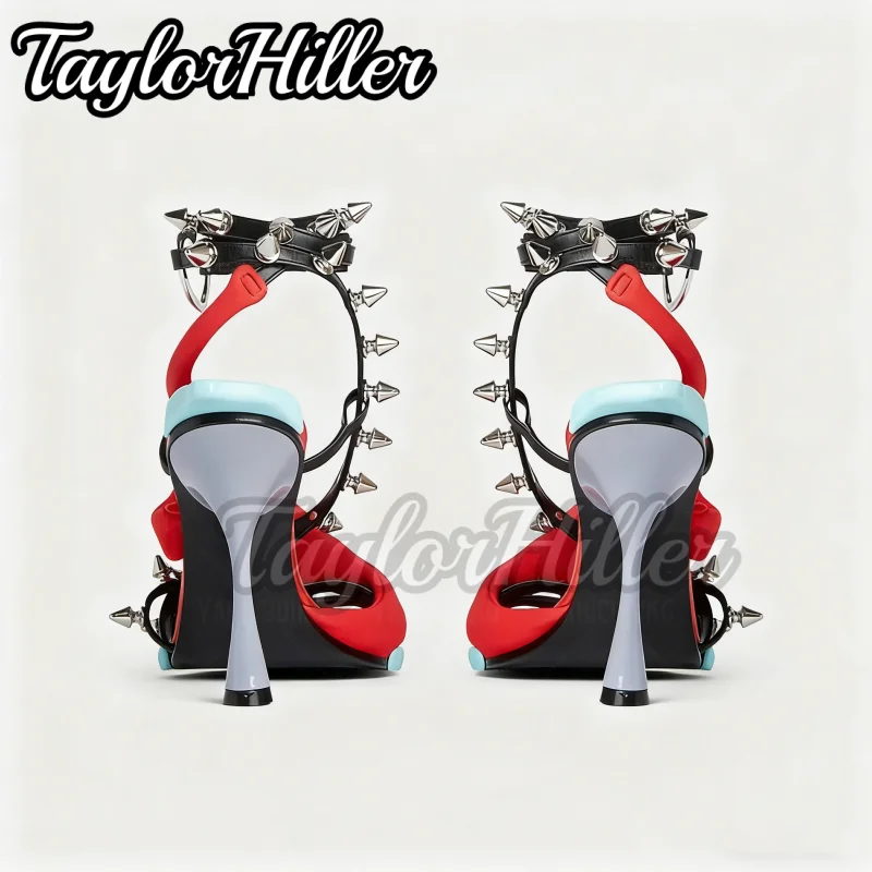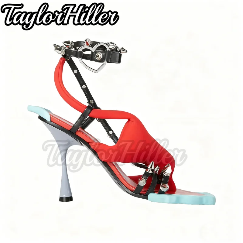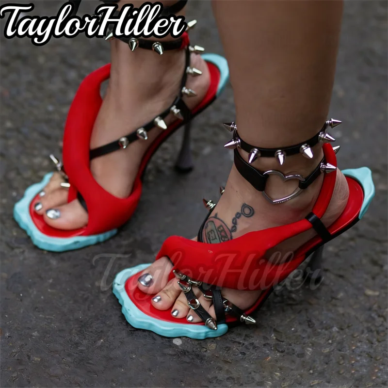 Punk Style Rivets Flower Heeled Sandals Open Toe Mixed Color High Heels Women Luxury Designer Summer Spike Heel Shoes Y2K Shoe