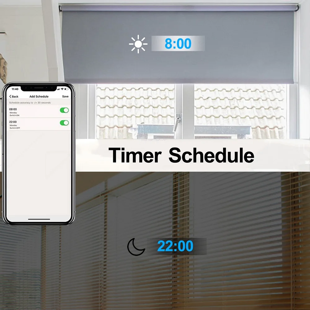 – You can set its schedule, such as opening at 8:00 in the morning and closing at 22:00 in the evening, and then your blinds can be automatically opened and closed at the specified time.