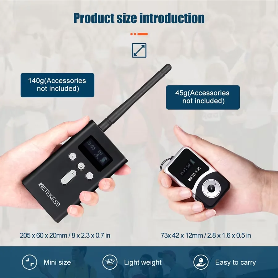 The frequency range is 195-216MHz, helping tour groups overcome background noise and distance from the guide.