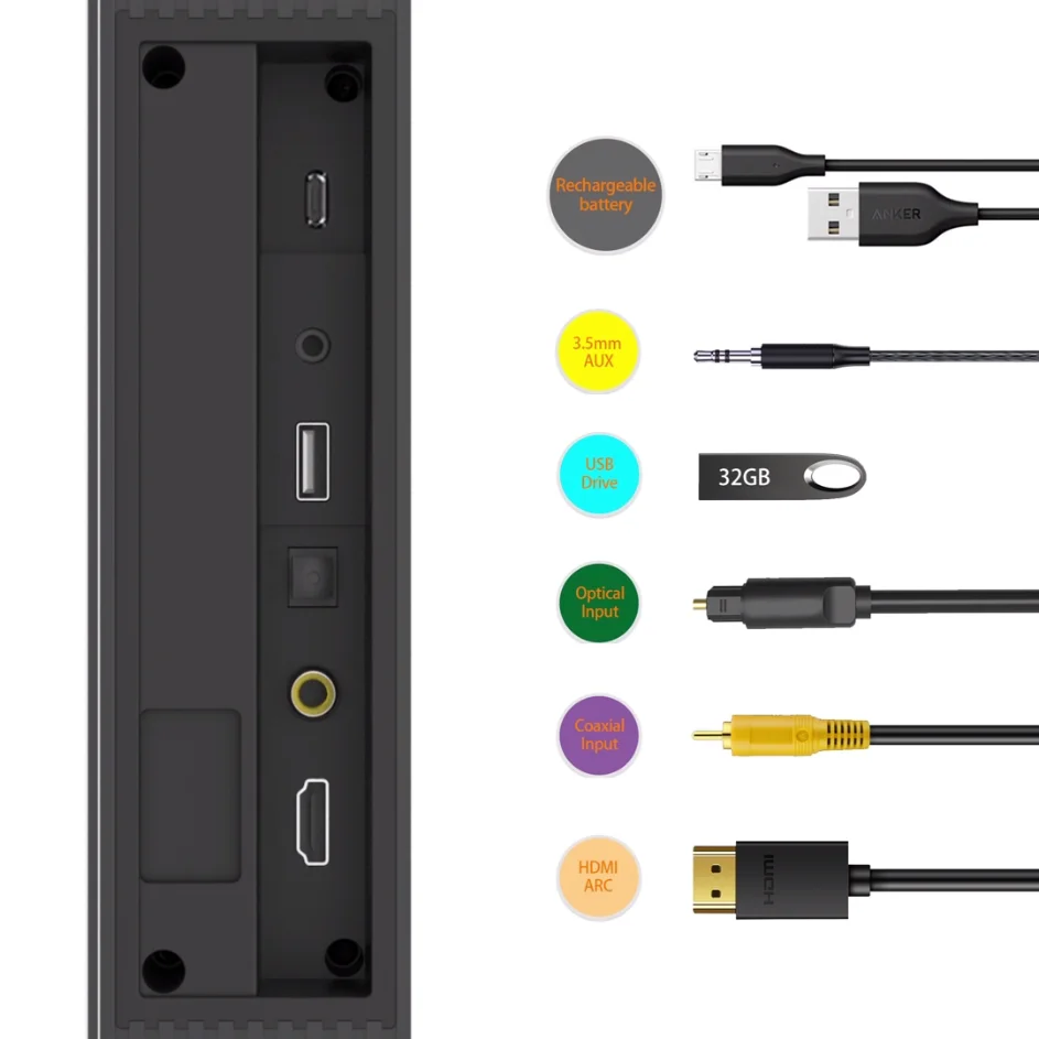 Coaxial interface,HDMI,3.5mm Aux, USB