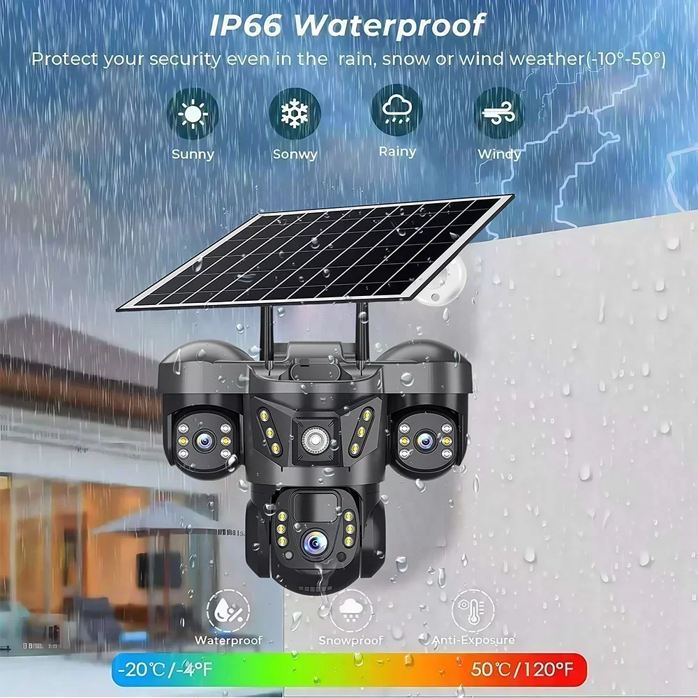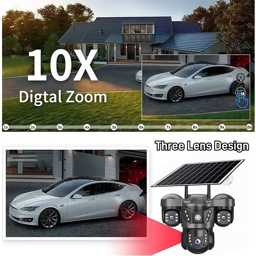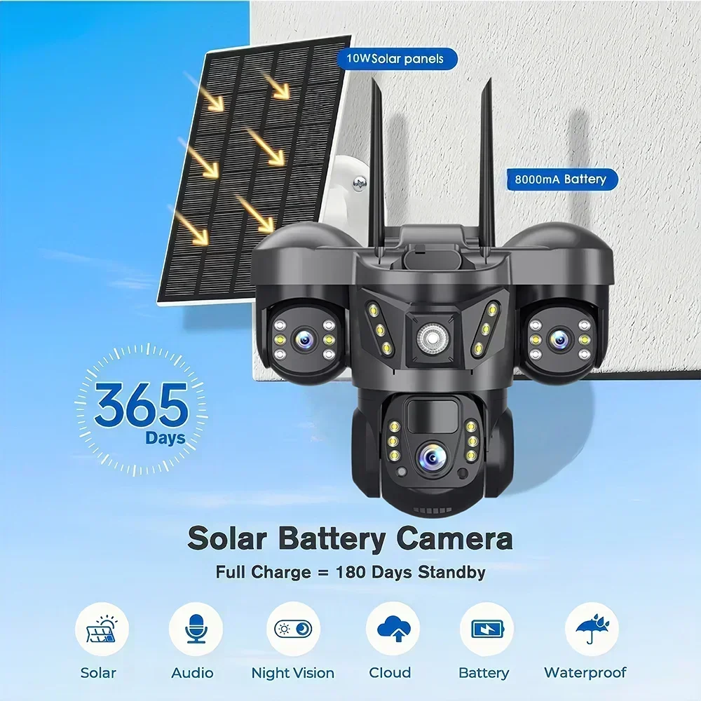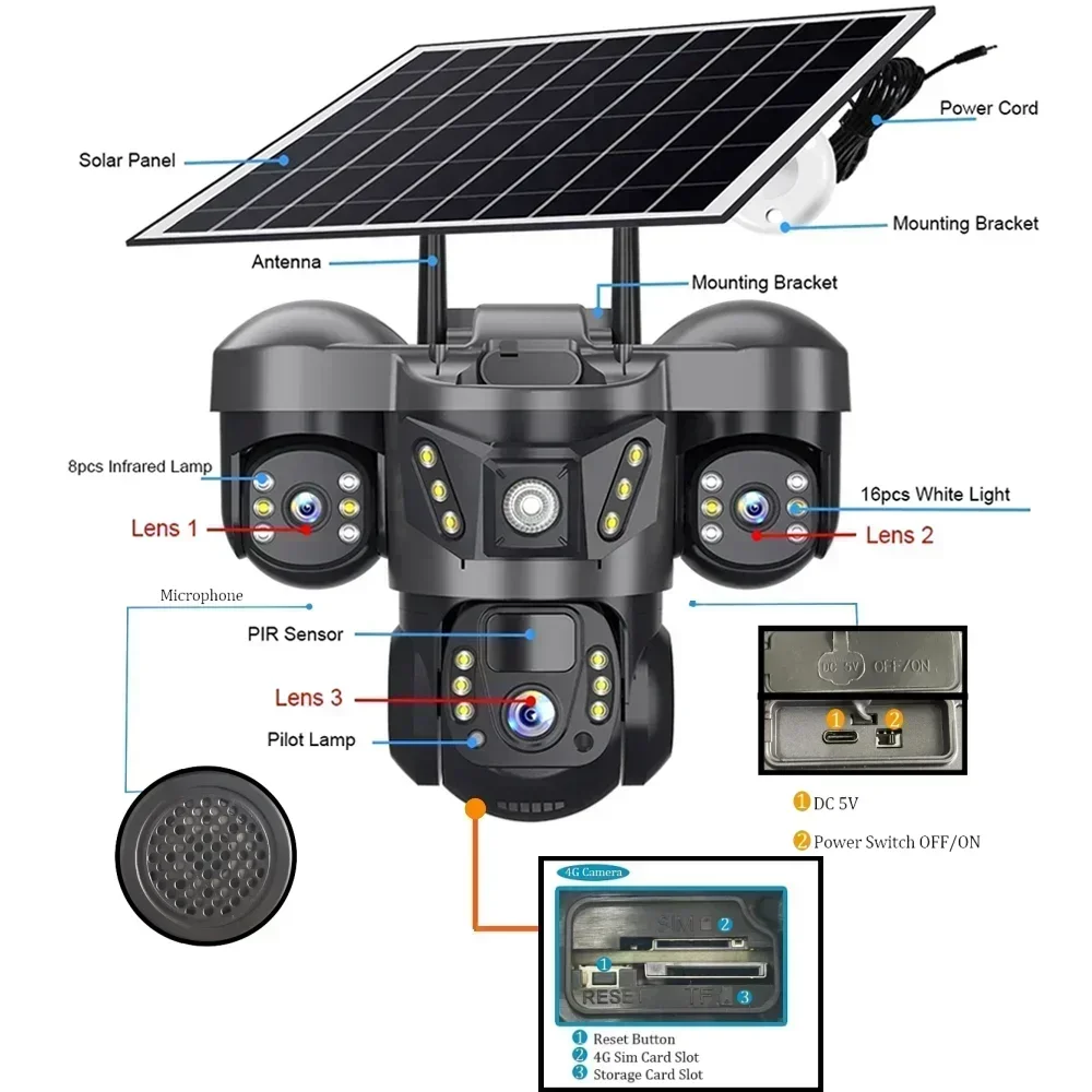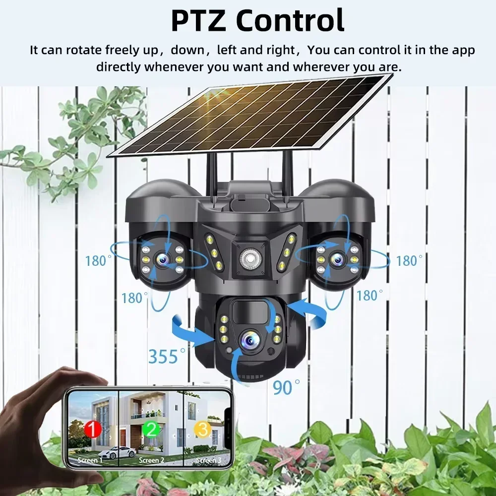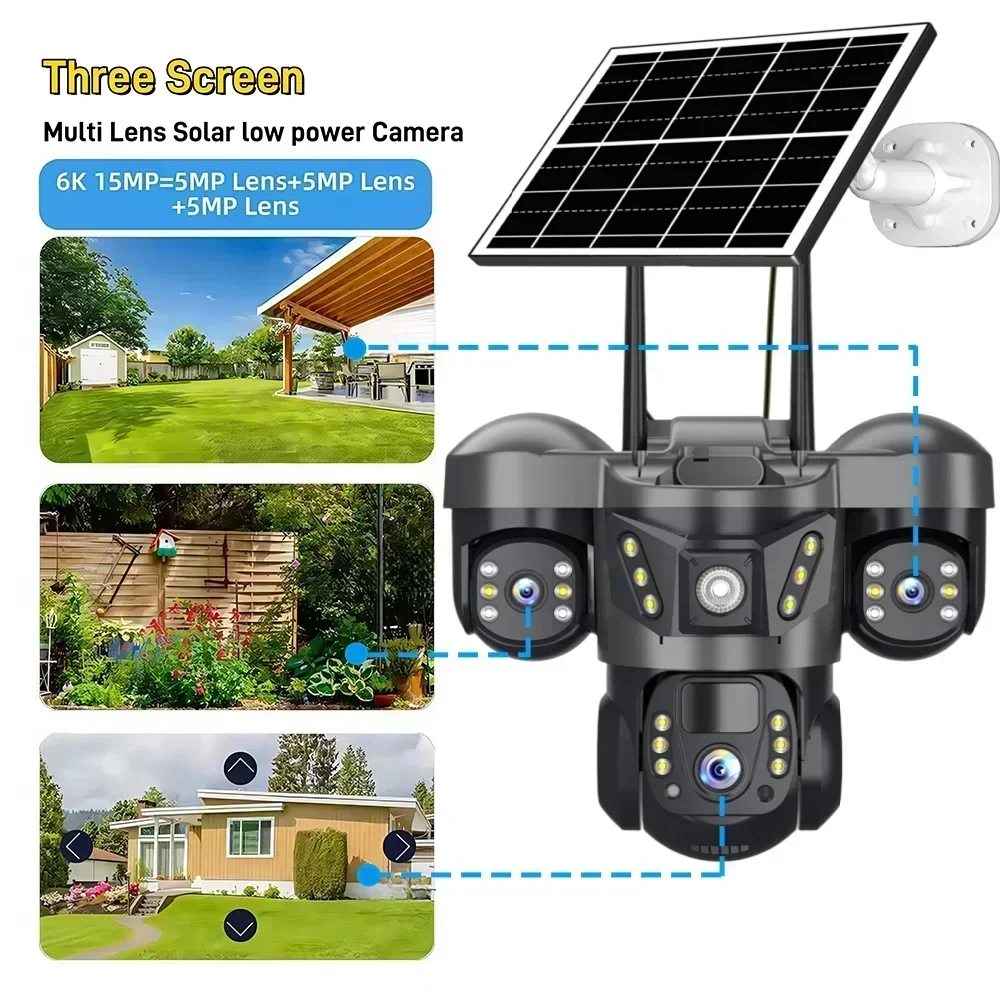 Solar 4G/WIFI IP Camera 15MP Three Lens Three Screen Waterproof Monitor Night Vision Security Protection PTZ Video Surveillance