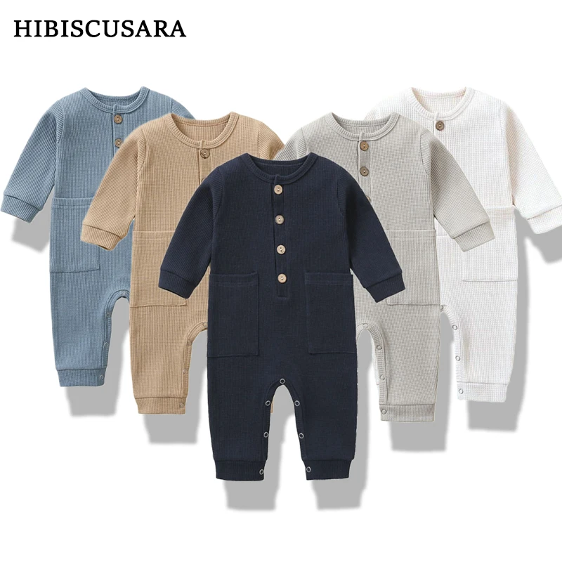 Spring Autumn Newborn Baby Romper Cotton Solid Soft Infant Jumpsuit With Pocket Girl Boy Long Sleeve Bebe Pajamas Wodden Buttons