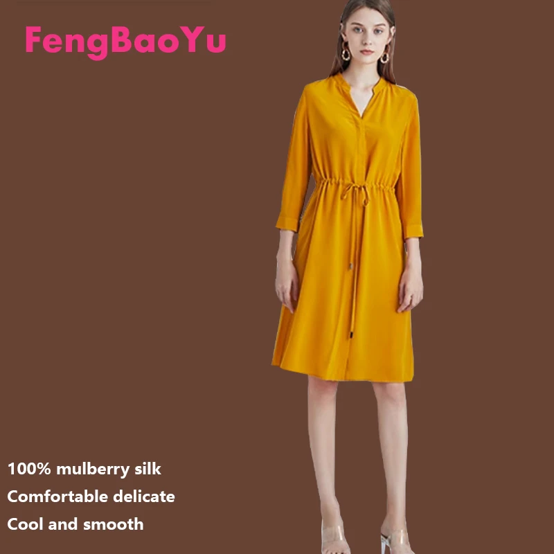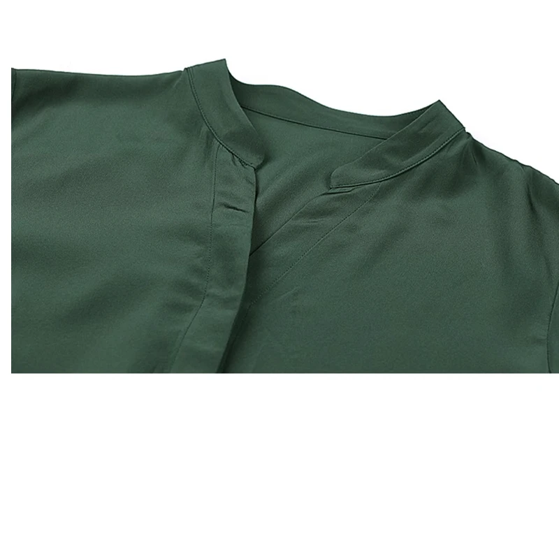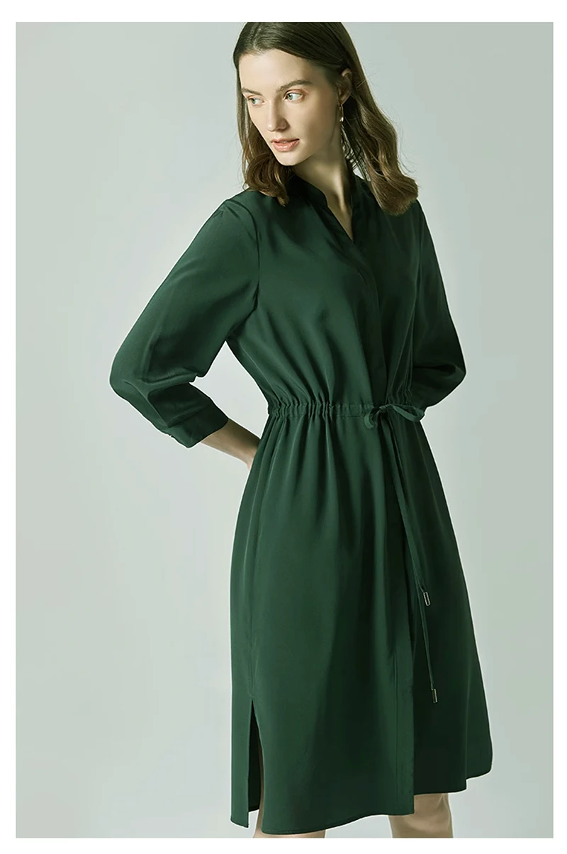 Spring summer 100% Silk Women’s Dress Dark Green Stand Collar Lace-up Mid-length Skirt Business Casual Temperament Women’s Dress