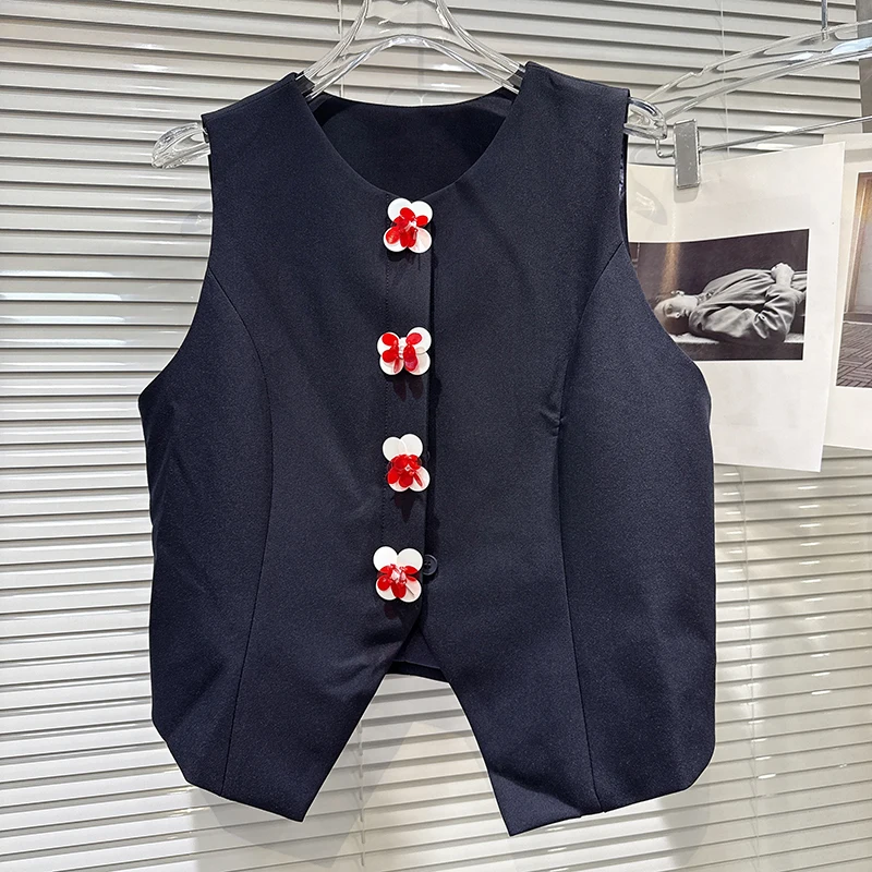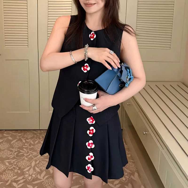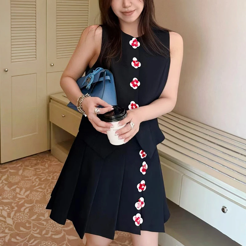 Street Fashion Casual Skirt Outfit Spring Women O Neck Sleeveless Top+High Waist Flower Button Bust Skirt Summer Two Piece Set