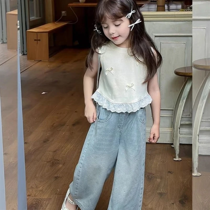 Stylish Children Tank Tops Vest Girls Summer Short Sleeveless Bow-Knot Floral Lace Clothes Kids Casual Wear Cute T-Shirt