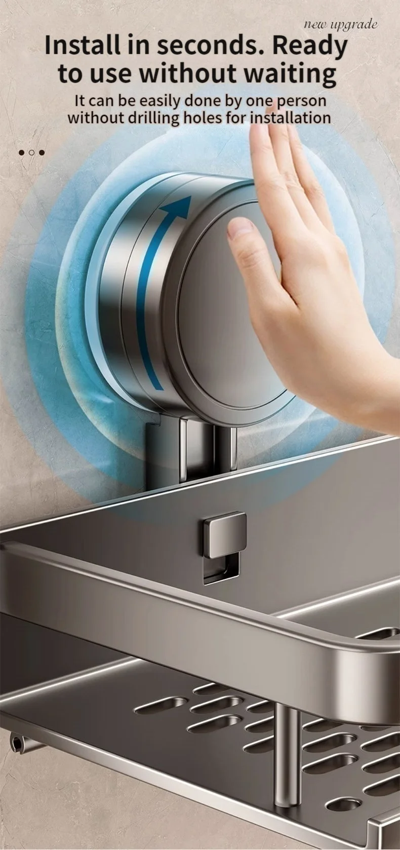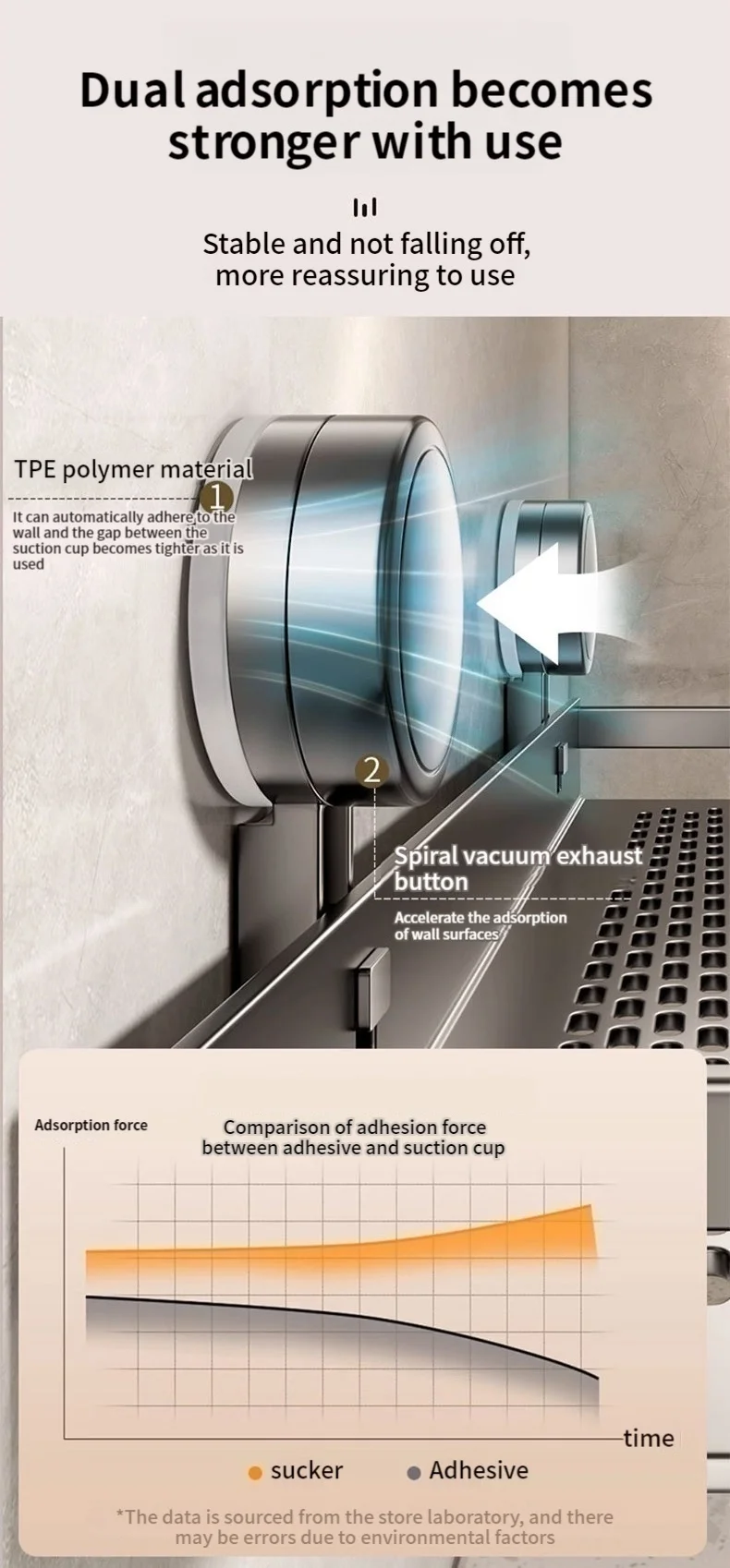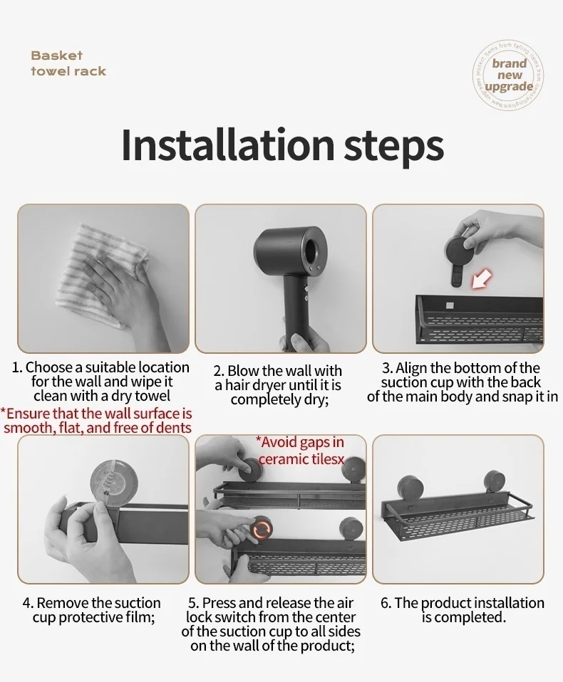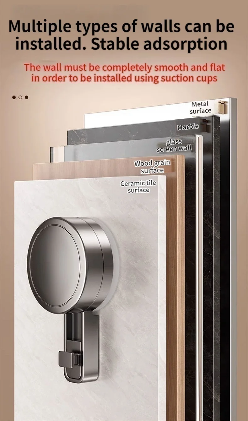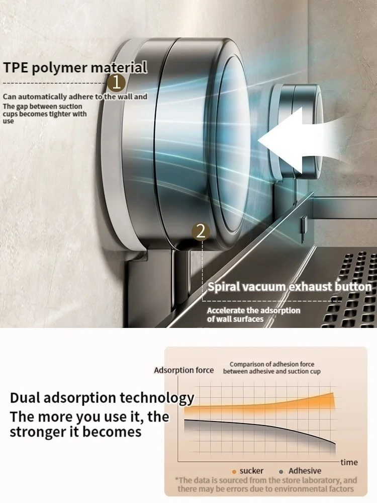 6. When installing the suction cup, please ensure that the suction cup and the wall are clean. At the same time, the wall must be 100% flat and smooth, without any cracks, holes or other conditionsWhen installing the suction cup, press all parts of the suction cup firmly to expel as much air as possible from insideLet it stand for about 24 to 36 hours before placing the items for use. Please do not use them during this period