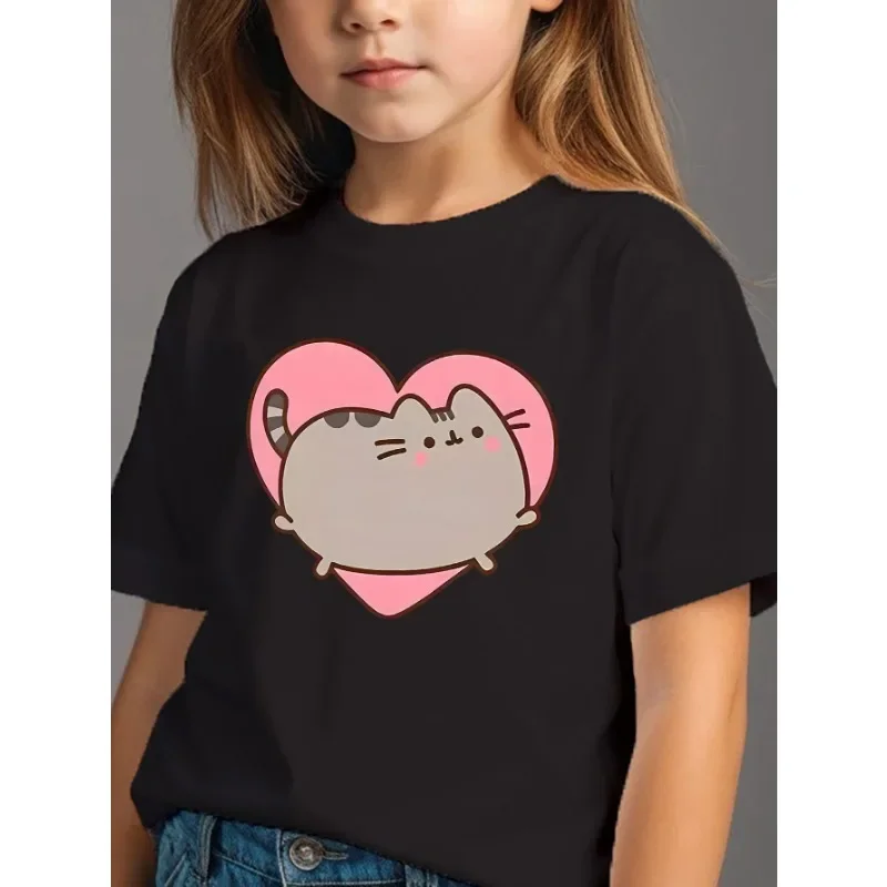 Summer Cute Cat Heart-shaped Printed Children’s T-shirt Girls Trendy Cotton Tees Soft Comfortable Kids Clothes Round Neck Tops