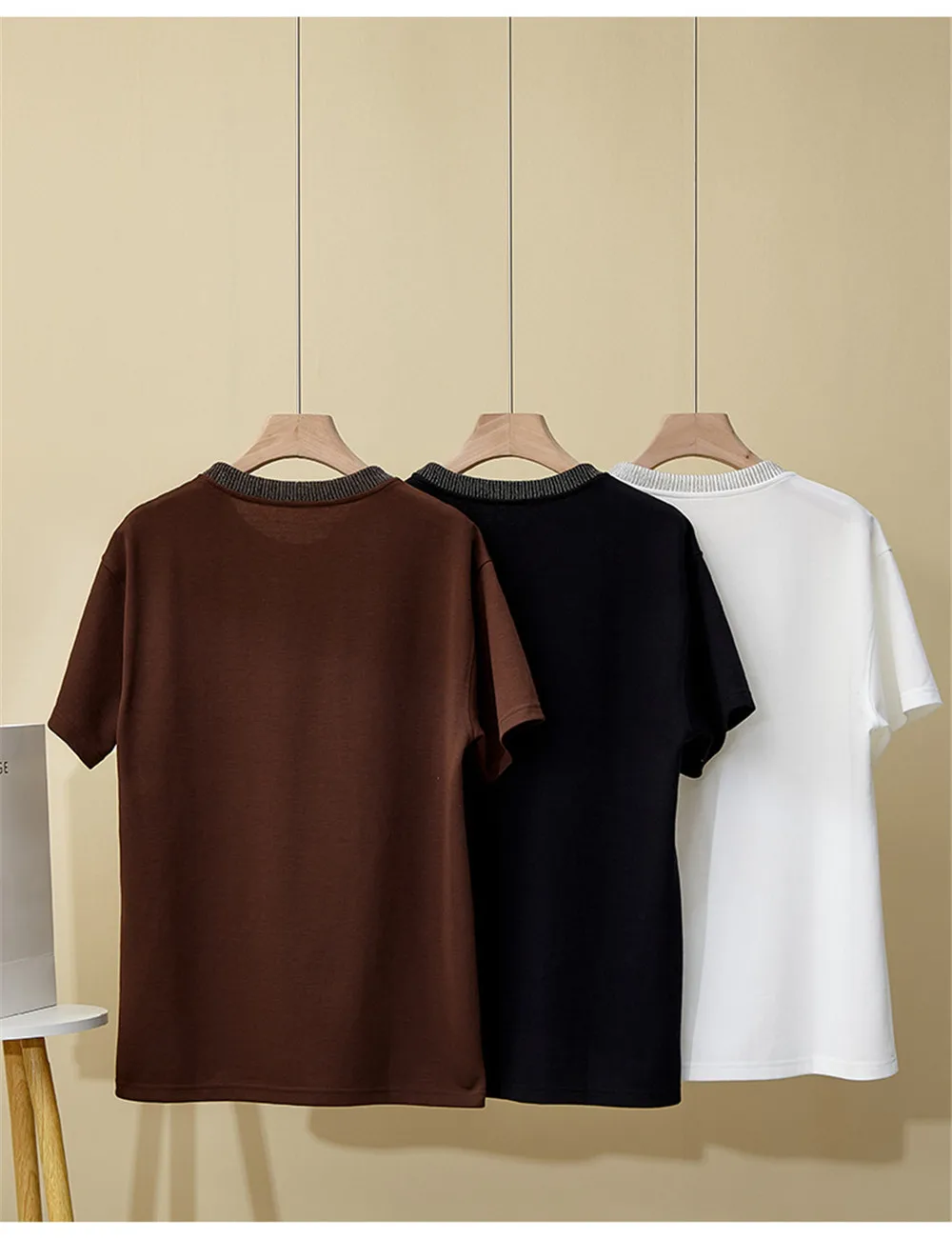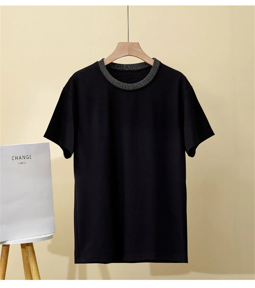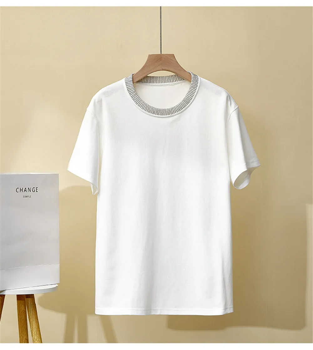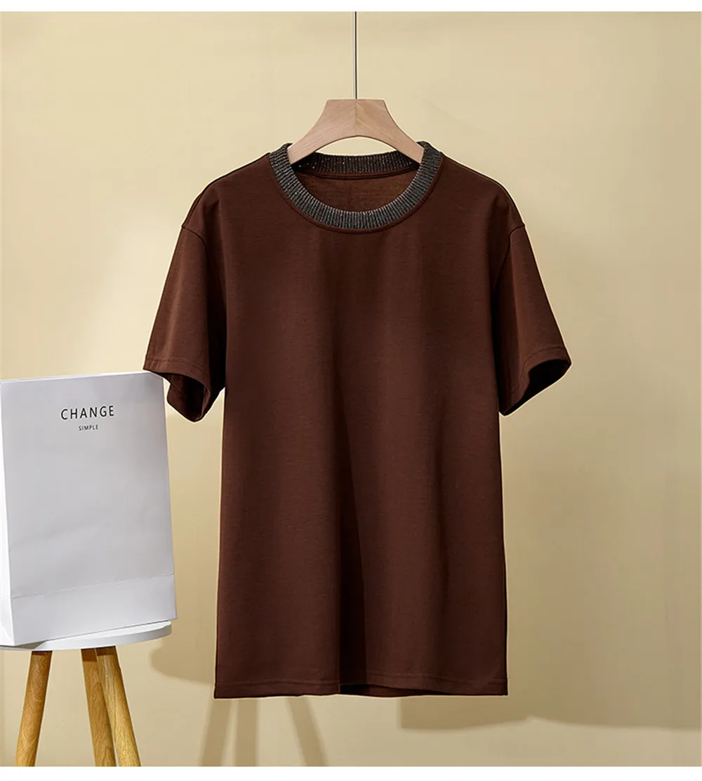 Summer Women Short Sleeved Bead Chain Round Neck Loose Casual Versatile T-Shirt Top