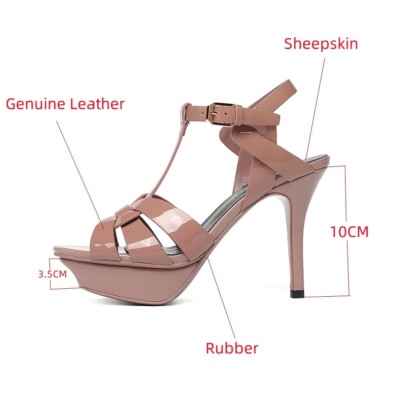- Features of the shoes: Genuine Leather,High Heels,Open toe,Solid color,Fish mouth shoes,Brand new shoes,High heeled sandals,The heel is 10 cm high,Waterproof platform 3.5CM,Hasp,Non slip rubber sole,Cowhide upper,Sheepskin lining,Sheepskin insoles