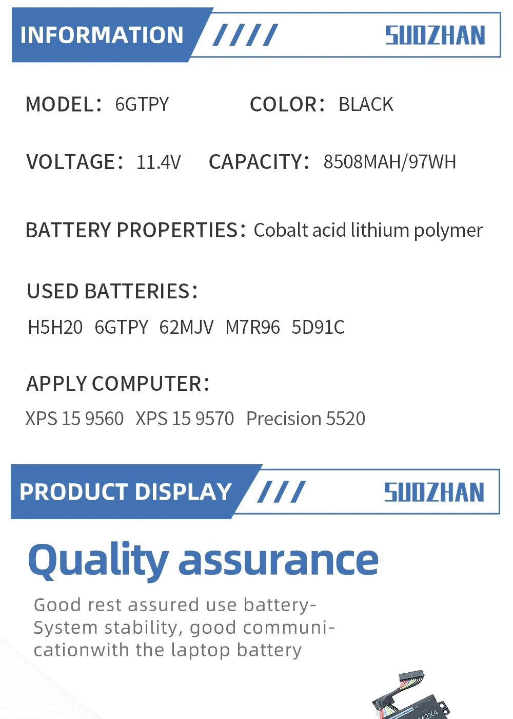 Be the first to review “SUOZHAN New 6GTPY H5H20 Laptop Battery For DELL XPS 15 9570 9560 7590 For DELL Precision 5520 5530 Series Notebook 11.4V 97WH”