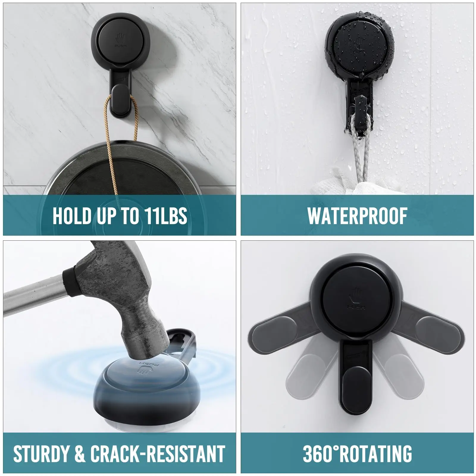 • Powerful suction cup: Inspired by the tentacles of octopus, the shower holder suction cup applied the new bionic technology to ensure waterproof, oil-proof and anti-aging. The towel hook with thicken plastic suction can hold up to 11 lbs and stick sturdily for years, available to remove and reinstall it in a new surfaces