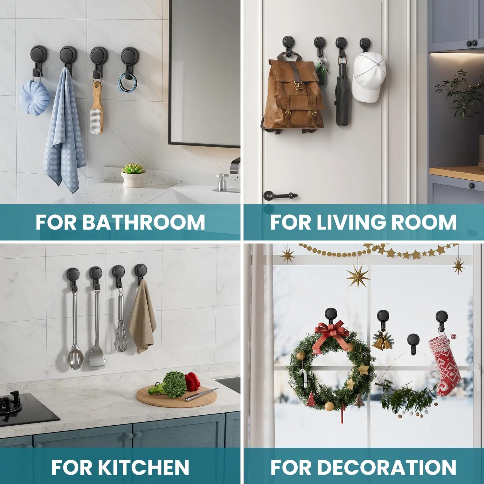 • Wide applications: These creative wall hooks provide the best organization solution for your bathroom, kitchen, basement, window, mirror and more place for hanging shower towels, sponges, bath brush, coats, bags, hats, keys, kitchenware, bath accessories etc. Hang whatever and wherever you want