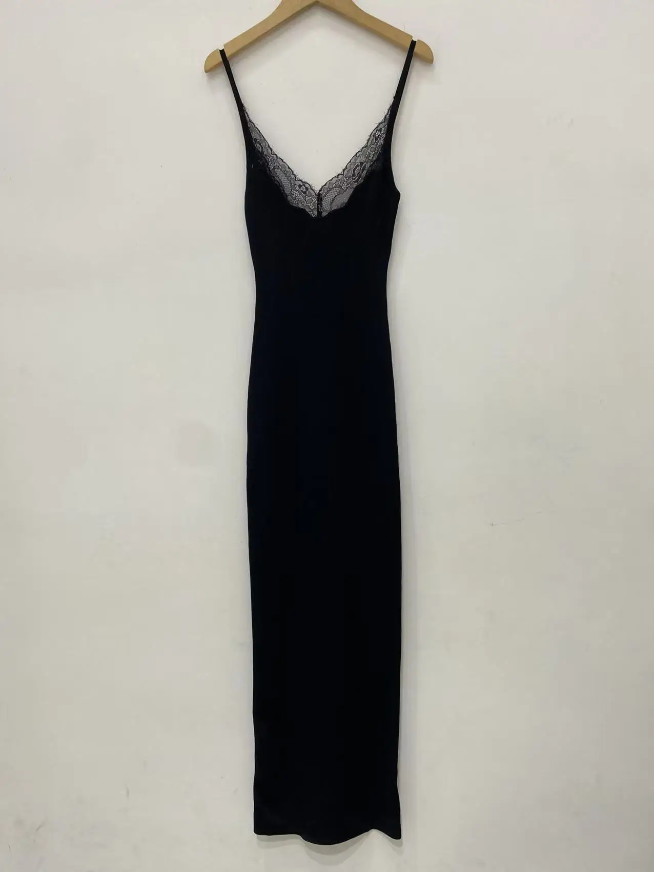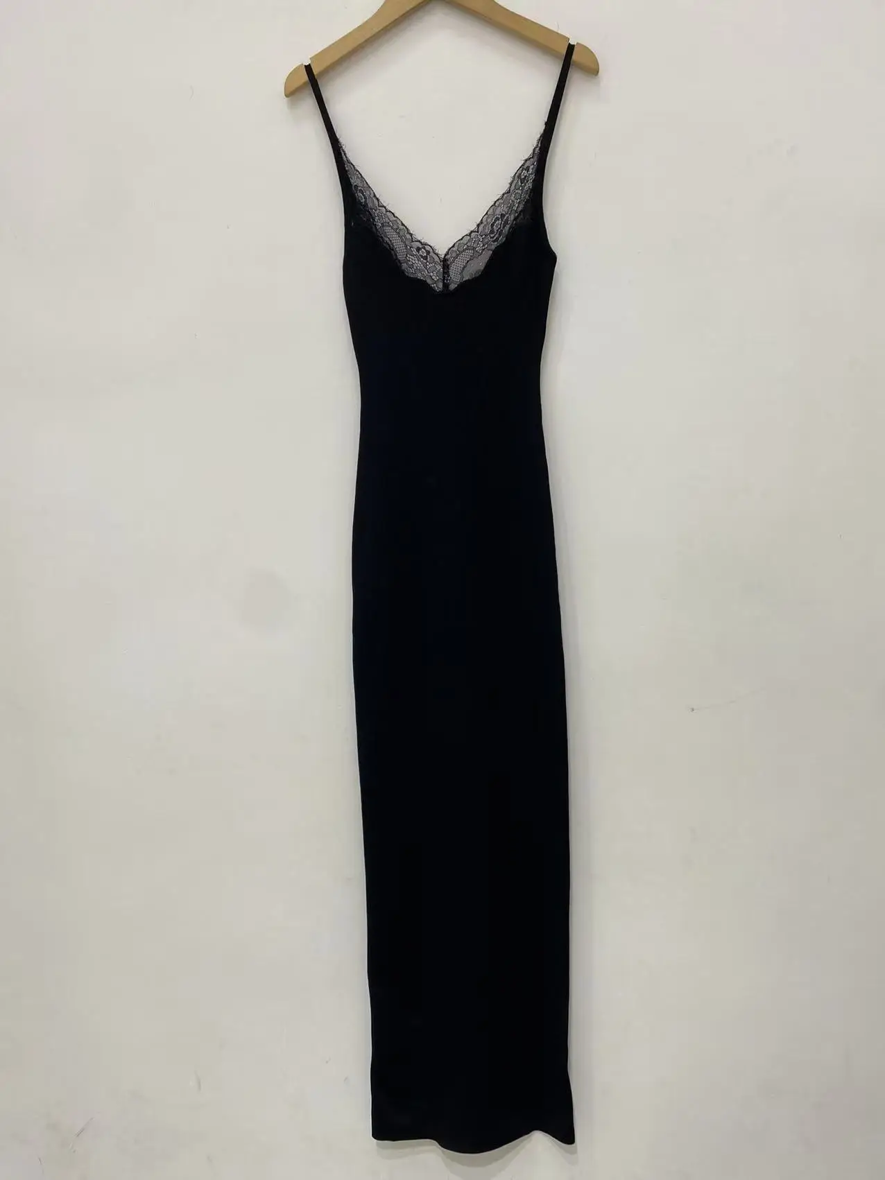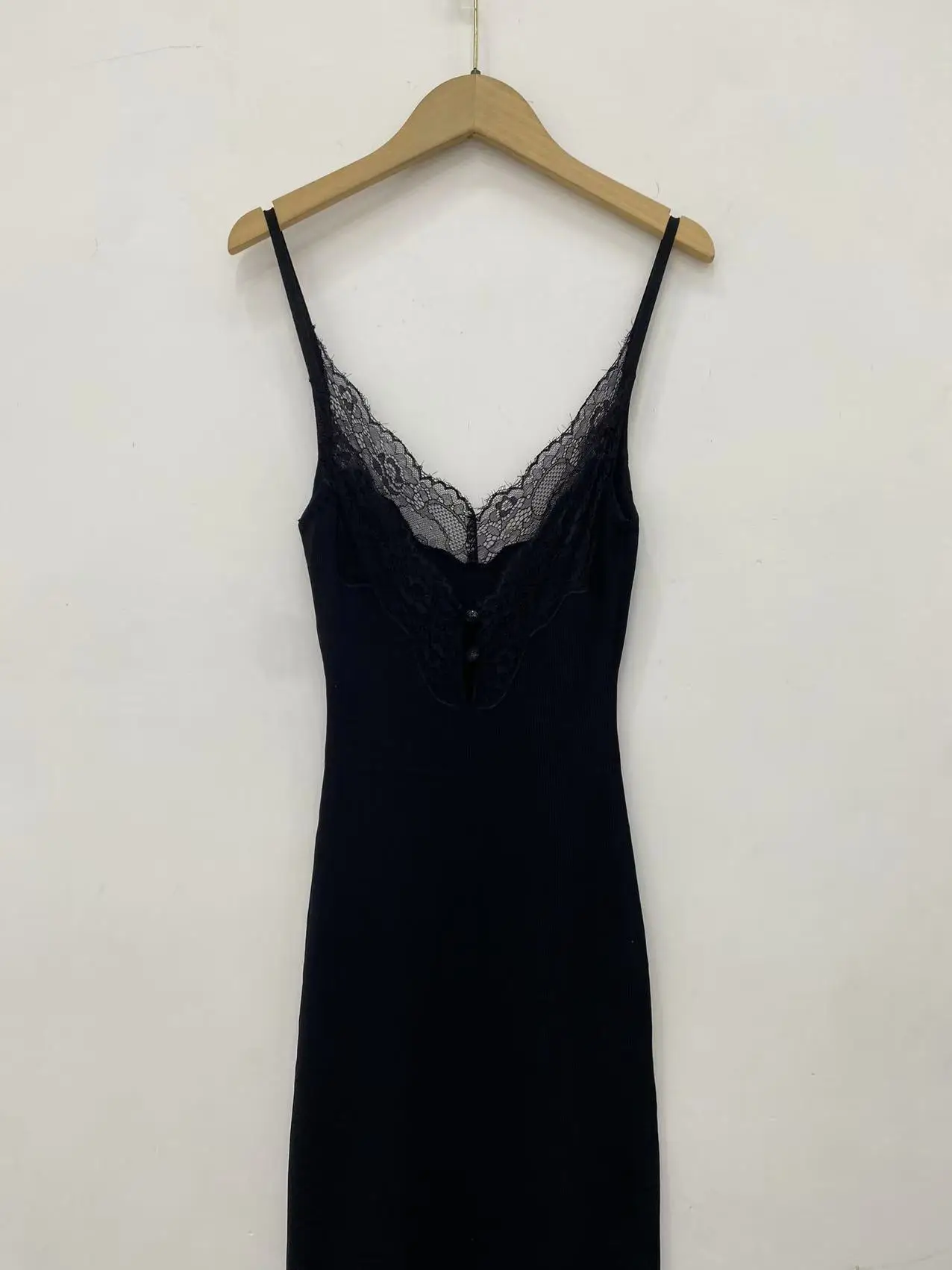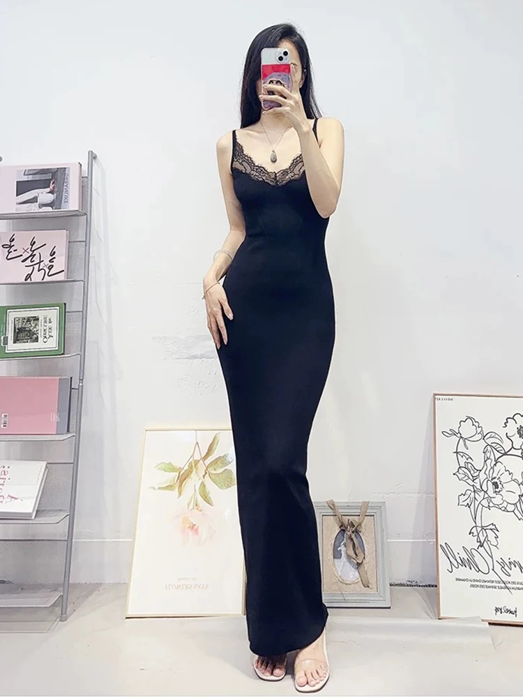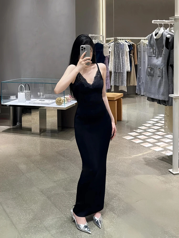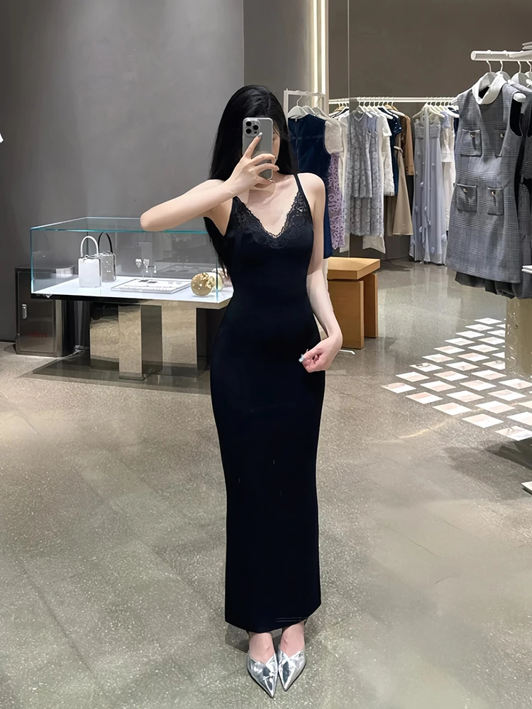 The 2025 summer classic black lace patchwork slimming and sexy body-hugging long dress with a halter top