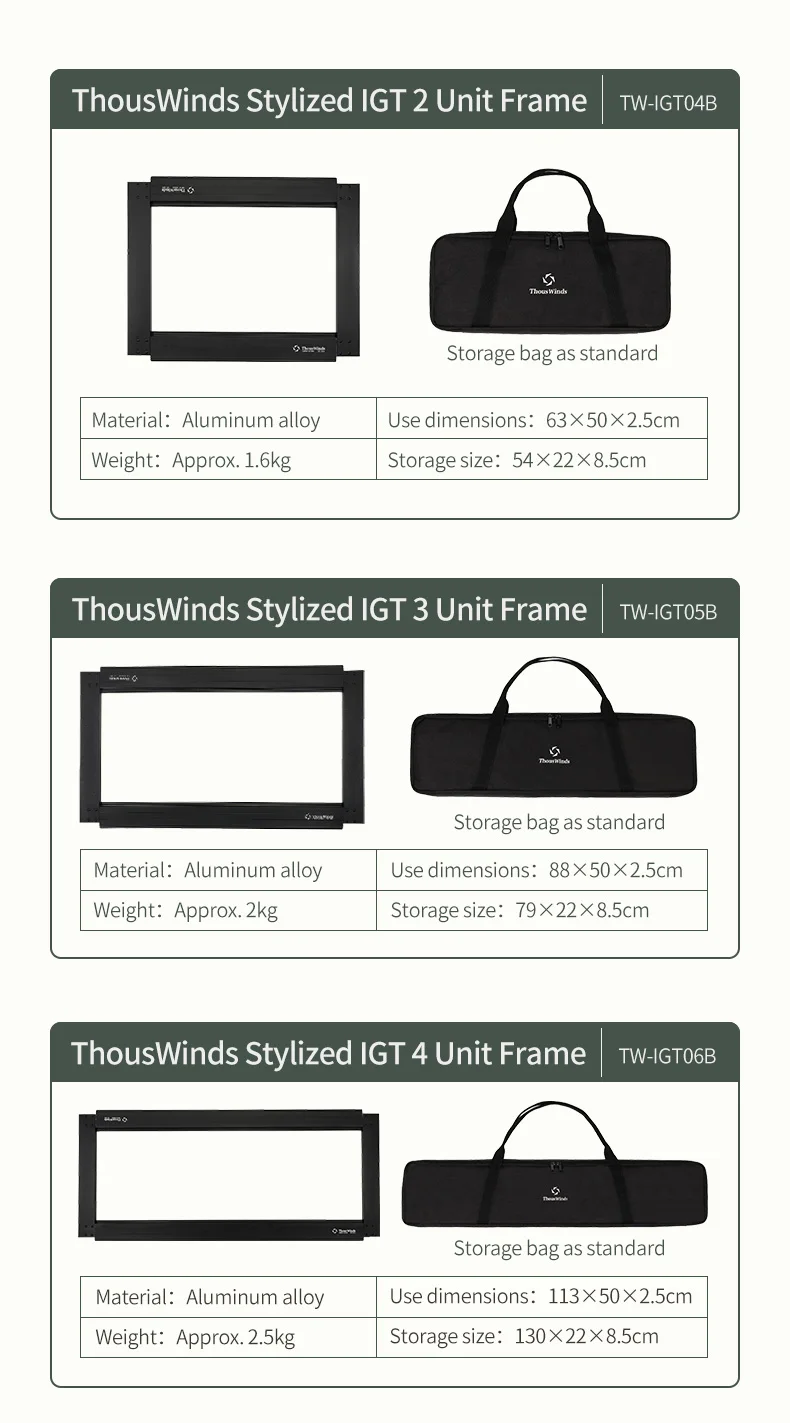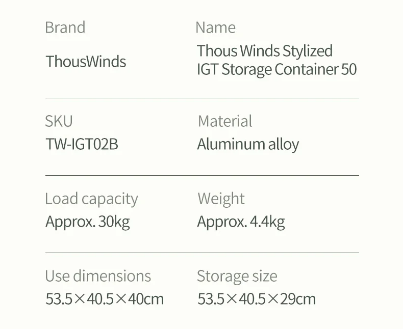 3. Snow Peak and other brands of Storage Container of the same size can also be adapted to all ThousWinds IGT system accessories with the purchase of the TW-IGT08B (Container 50L Extension Frame).
