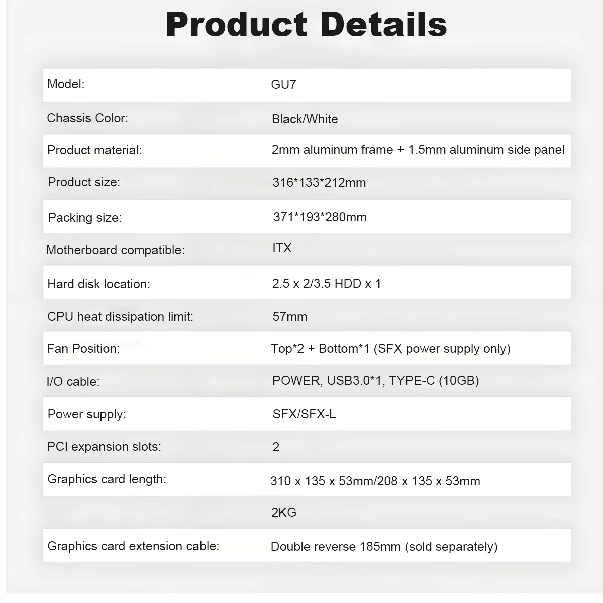 The GU7 model uses a 2mm thick 5052 aluminum sheet for molding, with the front, top, and rear of the case seamlessly integrated.