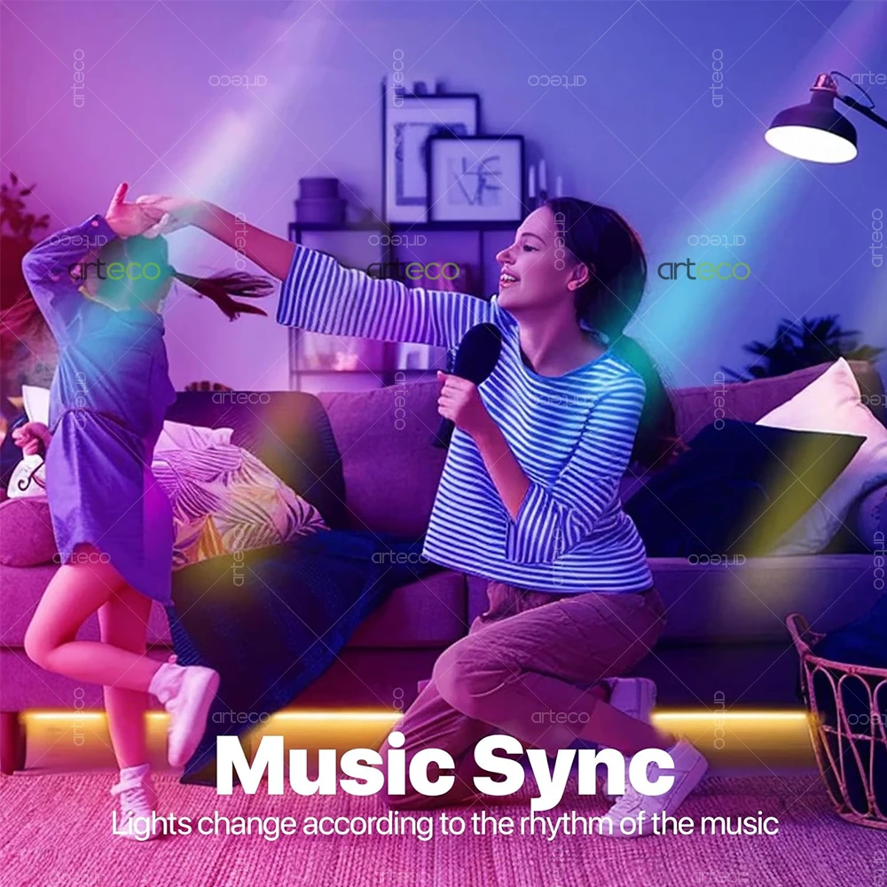 5) Music Sync: The lighting brightness can be changed in sync with the beat of your favorite music, creating a relaxing and calm atmosphere. Change any room to a dance floor, or create a relaxed and peaceful atmosphere. Such as living room, kitchen, bedroom and so on.