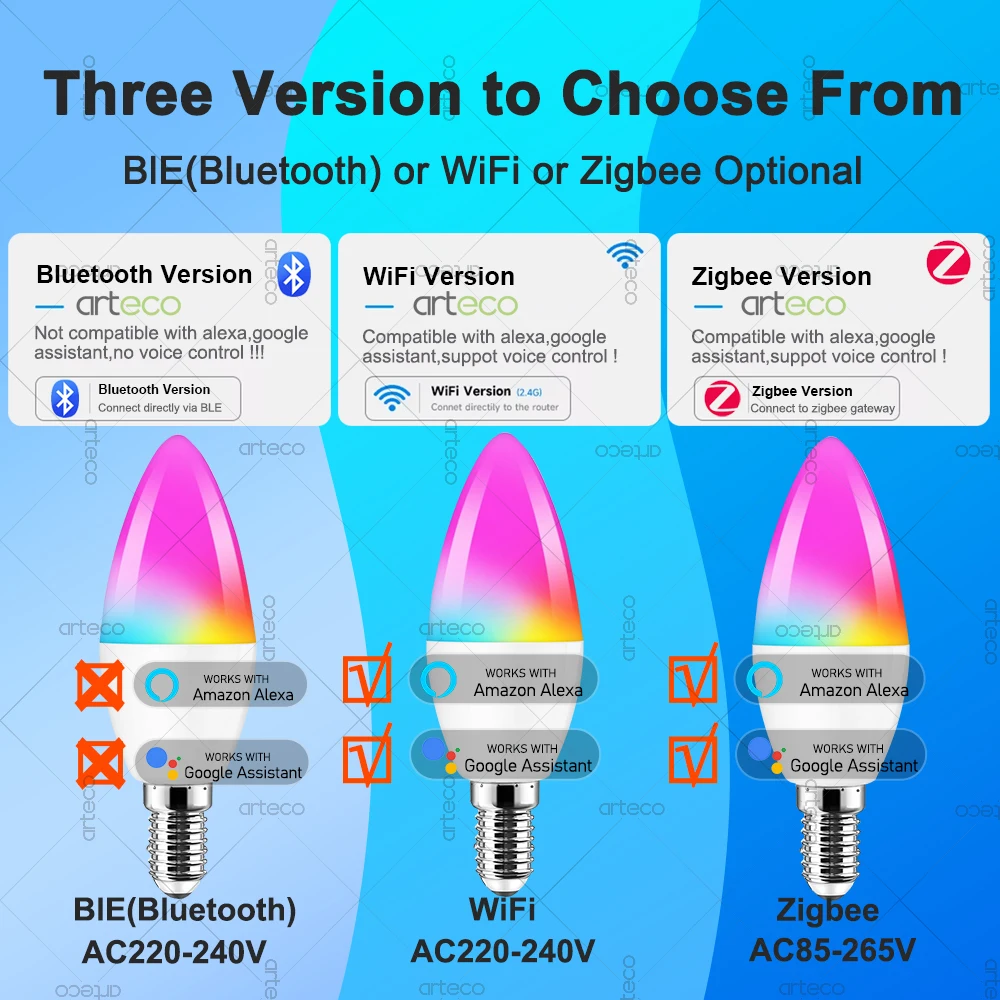 Tuya E14 LED Bulb WiFi Zigbee Bluetooth Optional,Dimmable Smart Led Lamp RGBCW Led Light Bulb Work With Alexa Amazon Google Home