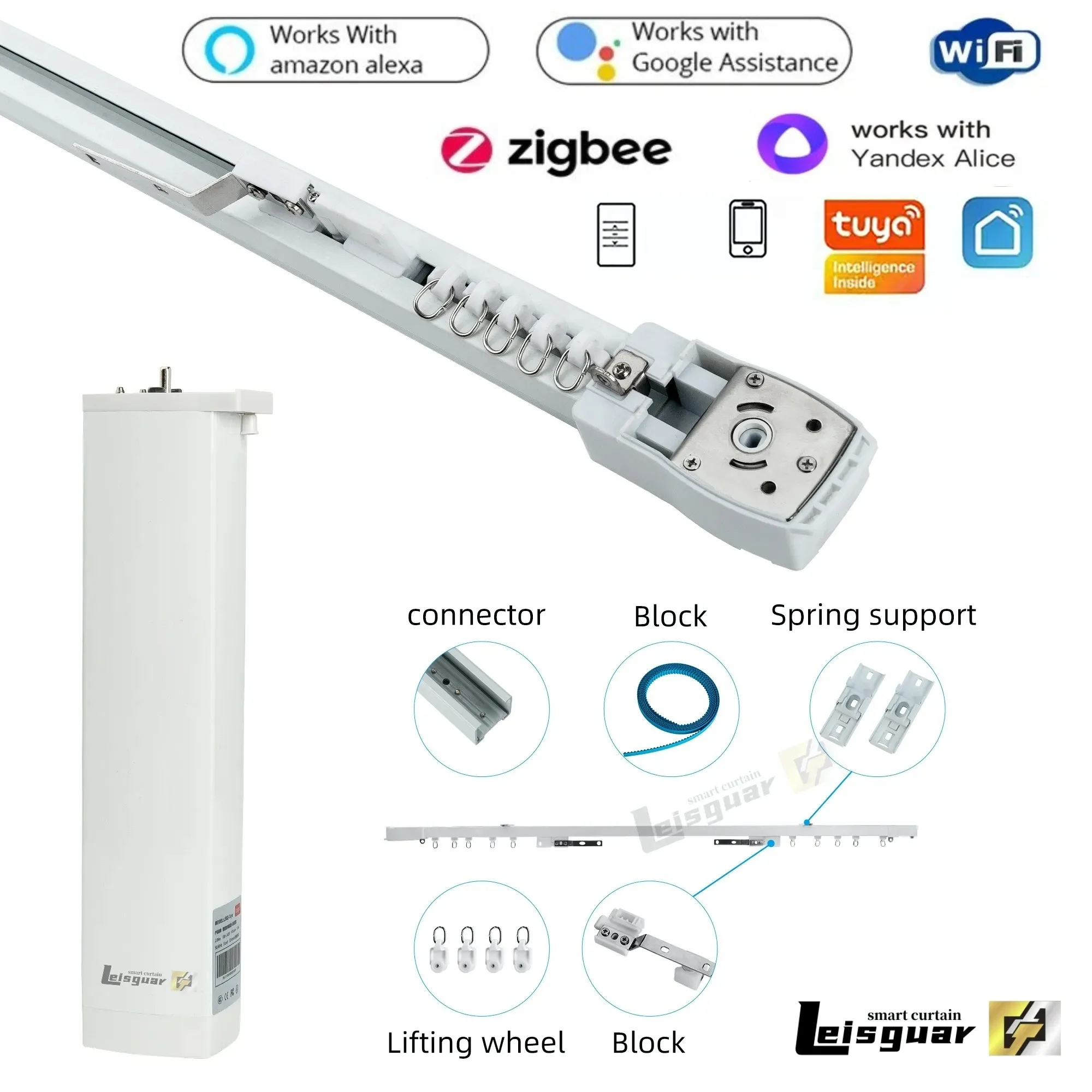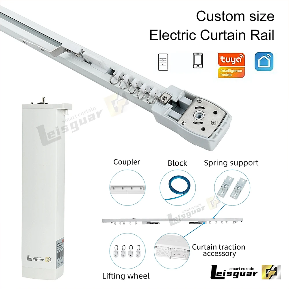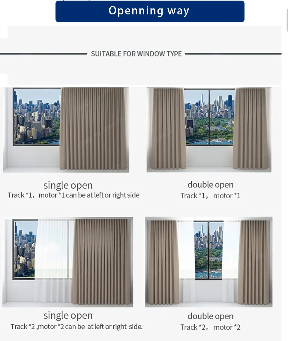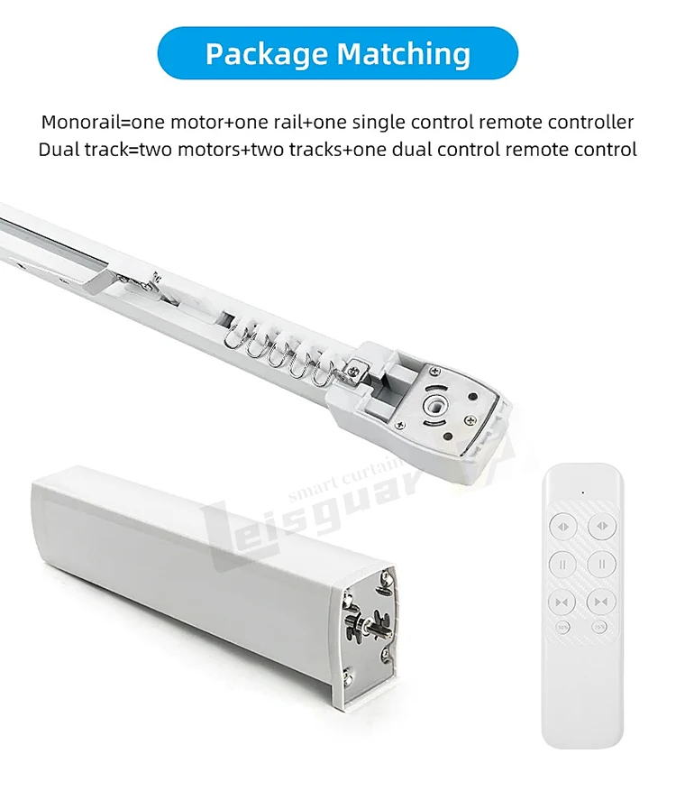 This link is the intelligent tuya curtain motor track system, single layer track contains 1 tuya Wifi motor + curtain track and mounting accessories + 1 single channel remote control, double layer track contains 2 tuya Wifi motor + curtain track and mounting accessories + 1 double channel remote control.