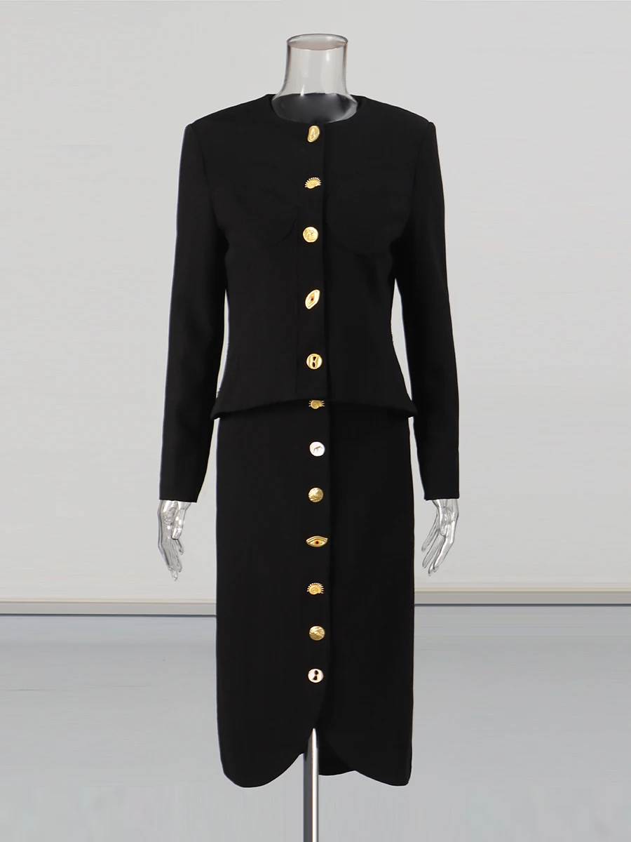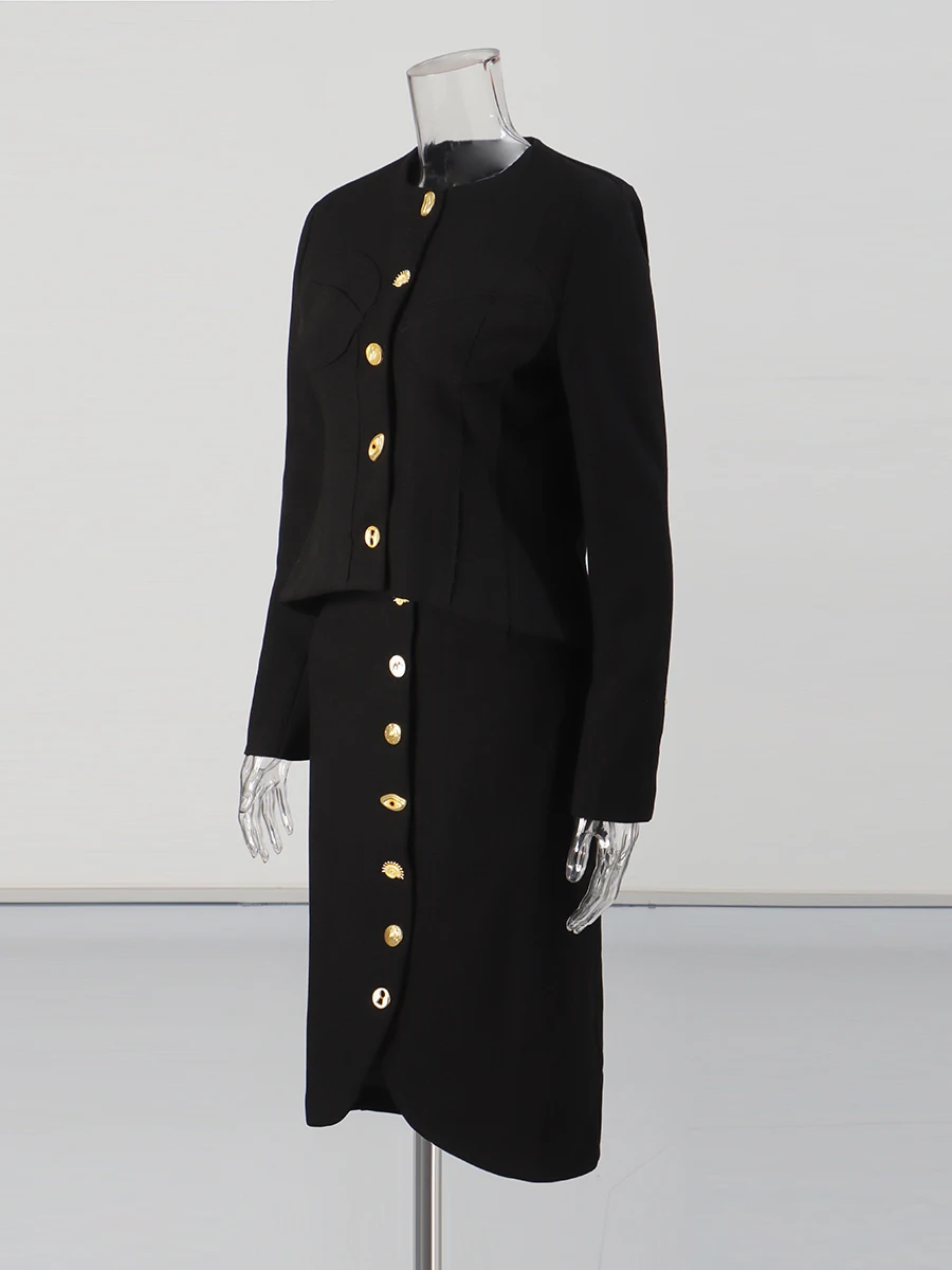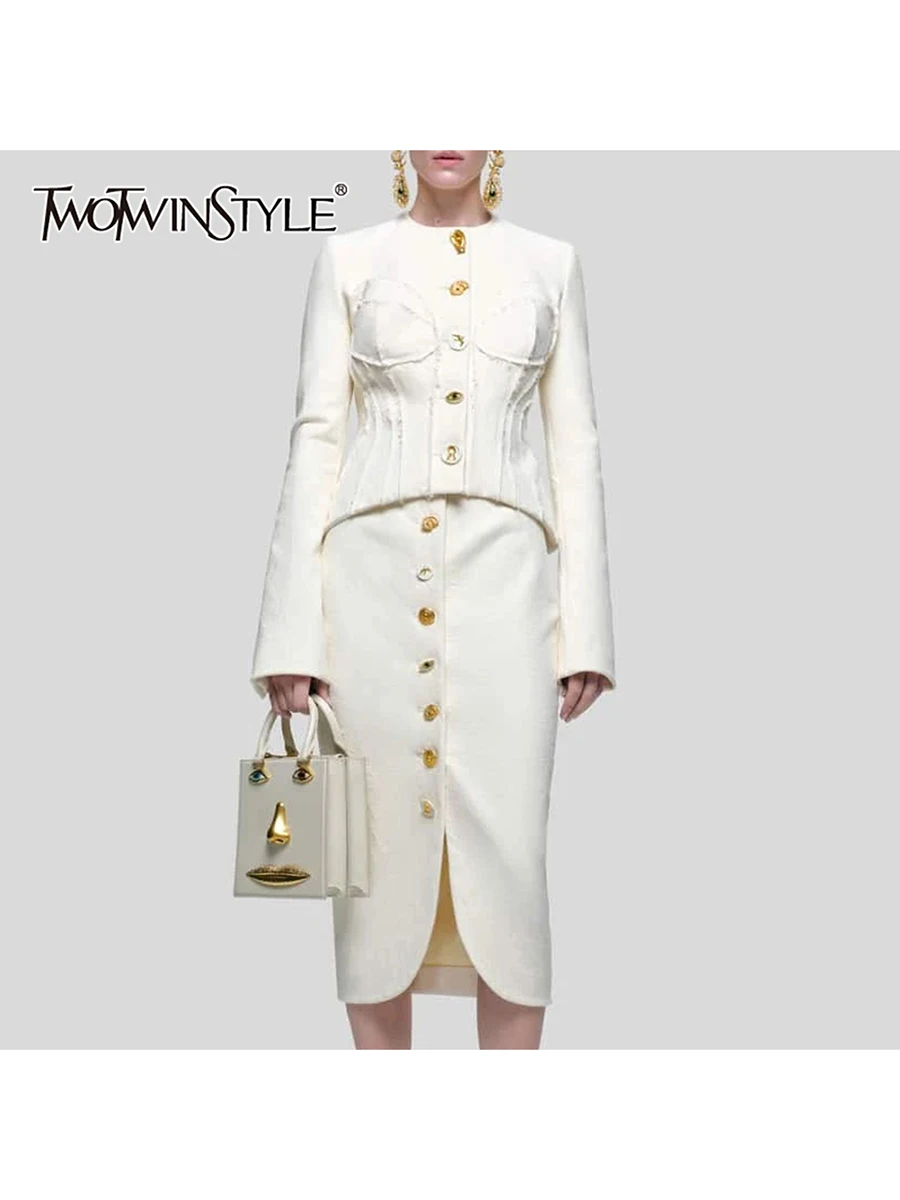 TWOTWINSTYLE Solid Spliced Single Breasted Two Piece Sets for Women O Neck Long Sleeves Top High Waist Split Skirt Set Female