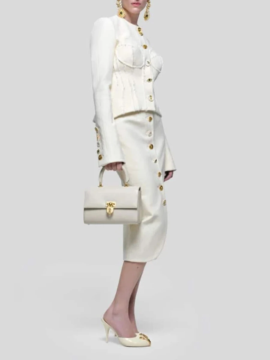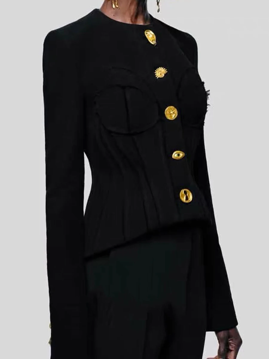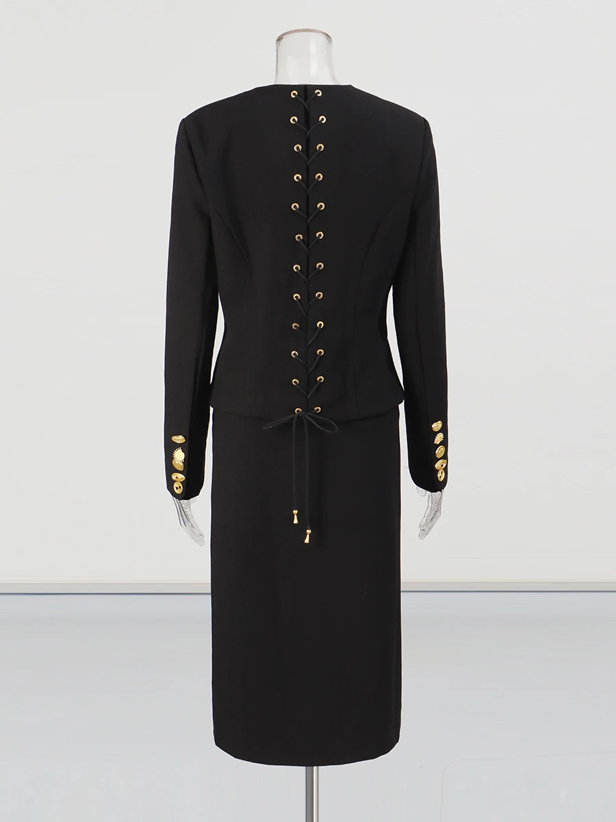 TWOTWINSTYLE Solid Spliced Single Breasted Two Piece Sets for Women O Neck Long Sleeves Top High Waist Split Skirt Set Female