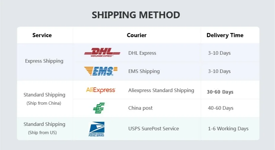 2.Delivery date is around 30-55days for Europe/USA/CA/AU ; Aound 25-45 days for Russia;(The specific time is subject to the transportation time)