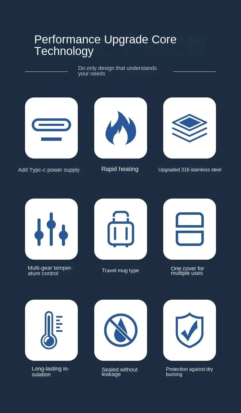 • Integrated design: The integrated design of this water cup combines functionality and style, providing an effective solution for heating beverages while driving.