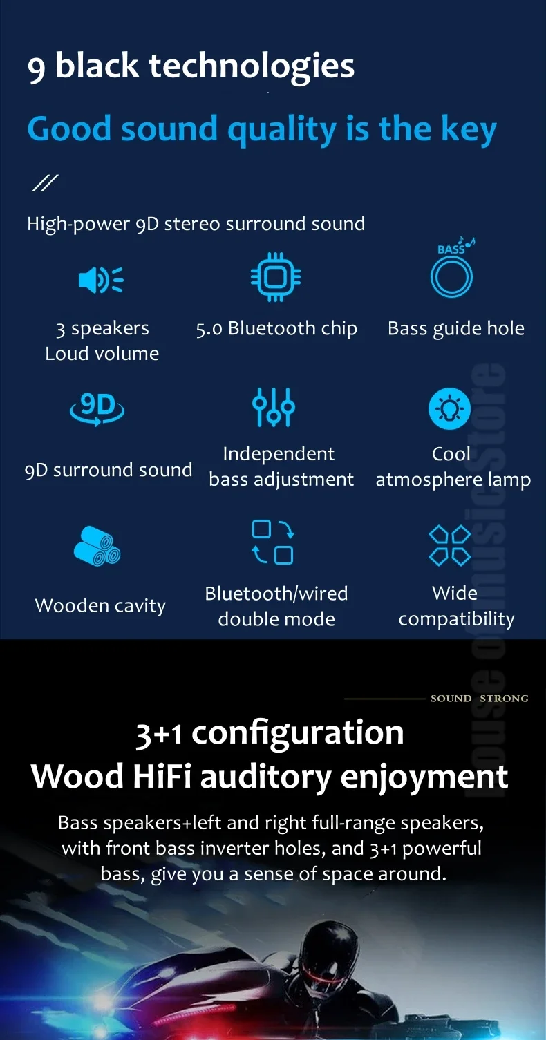 - Sound Mode: Stereo Sound Mode,Extra Bass Mode,Standard Mode
