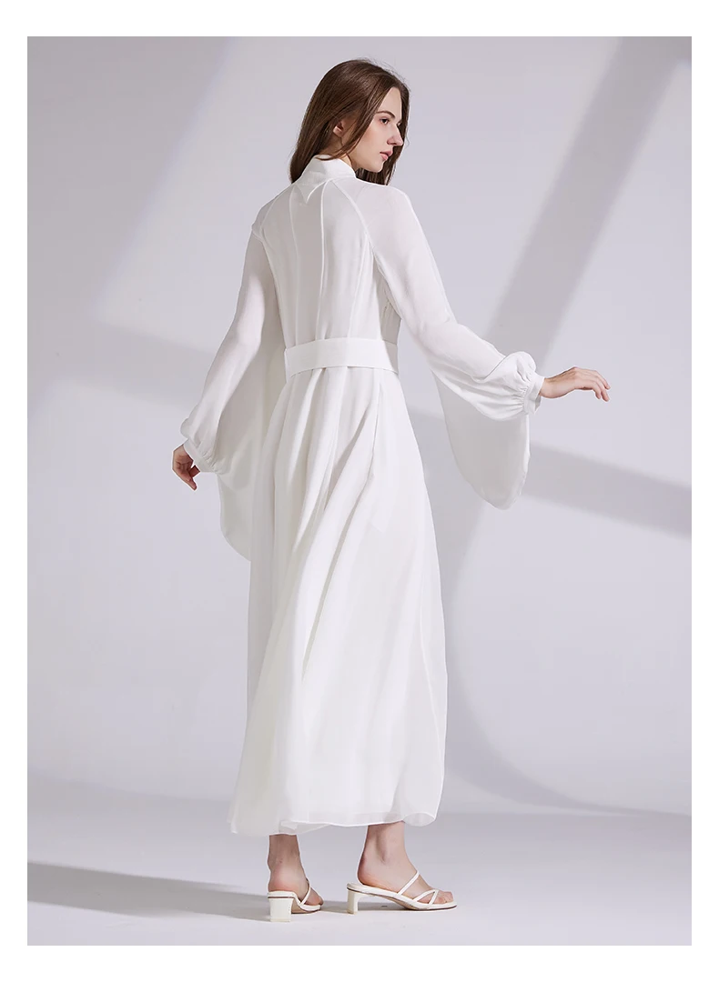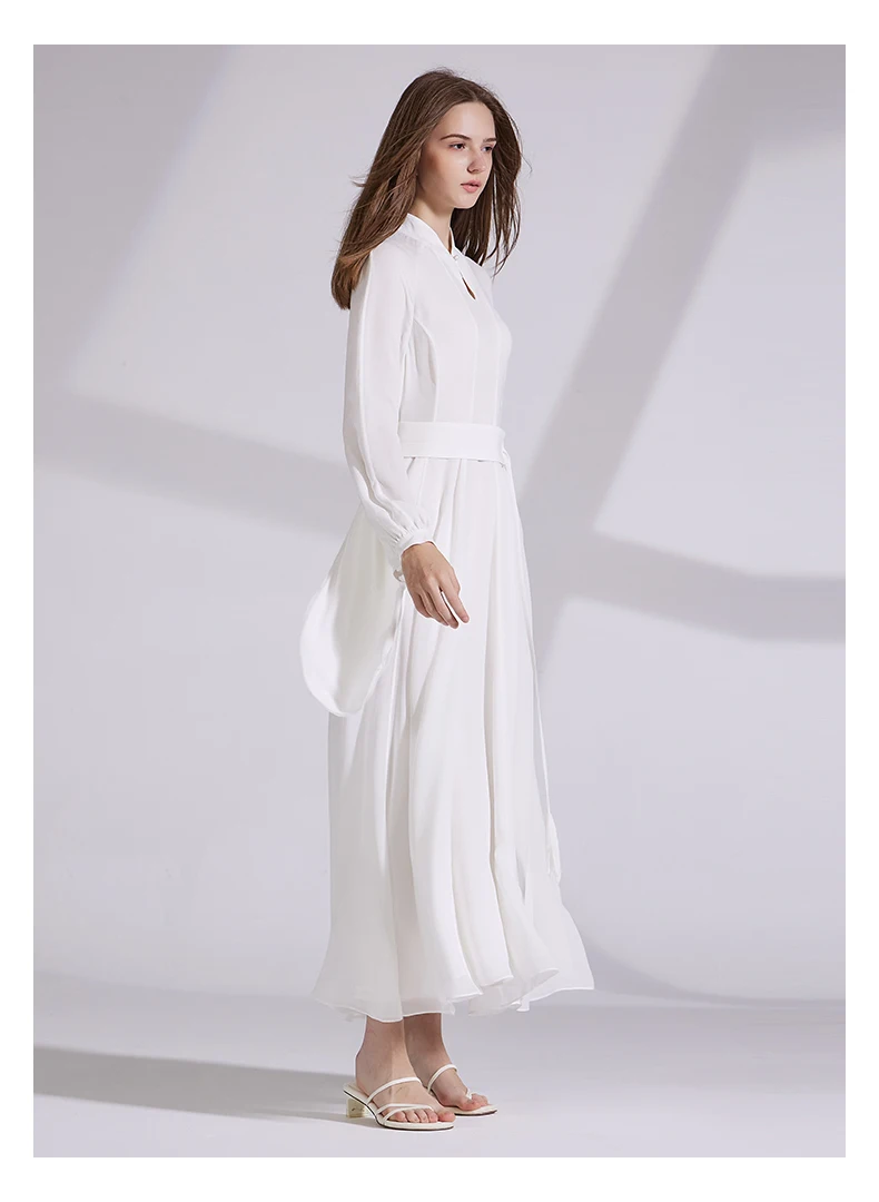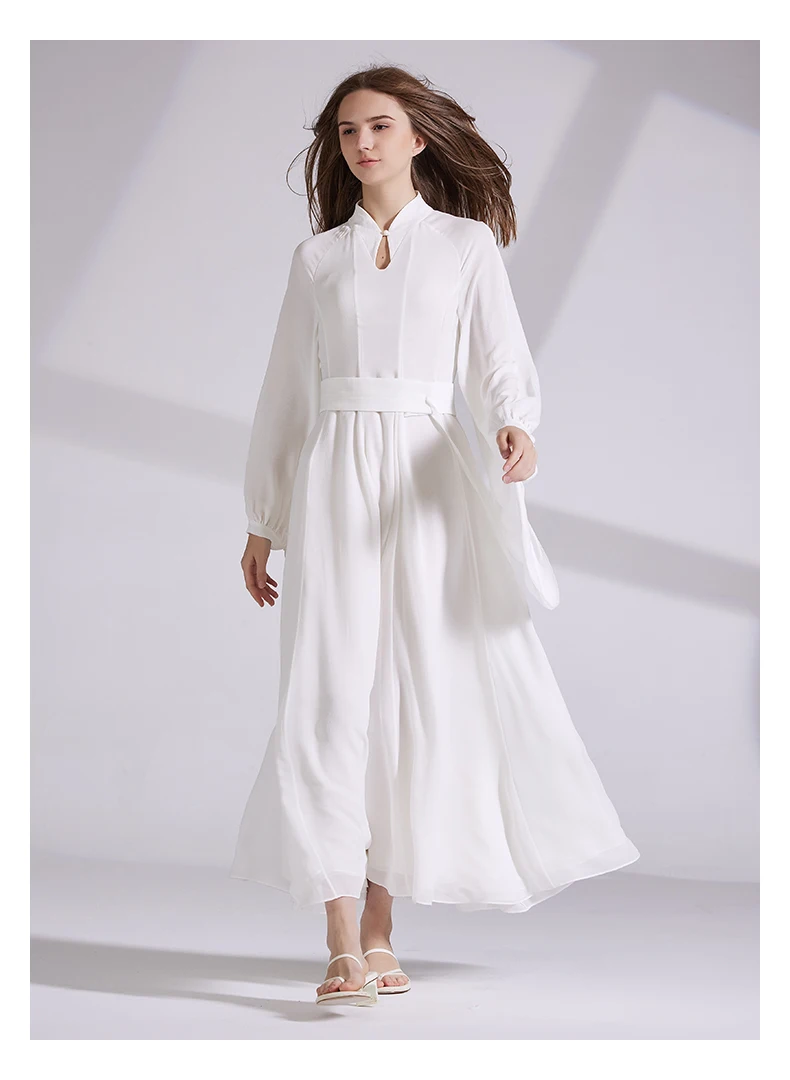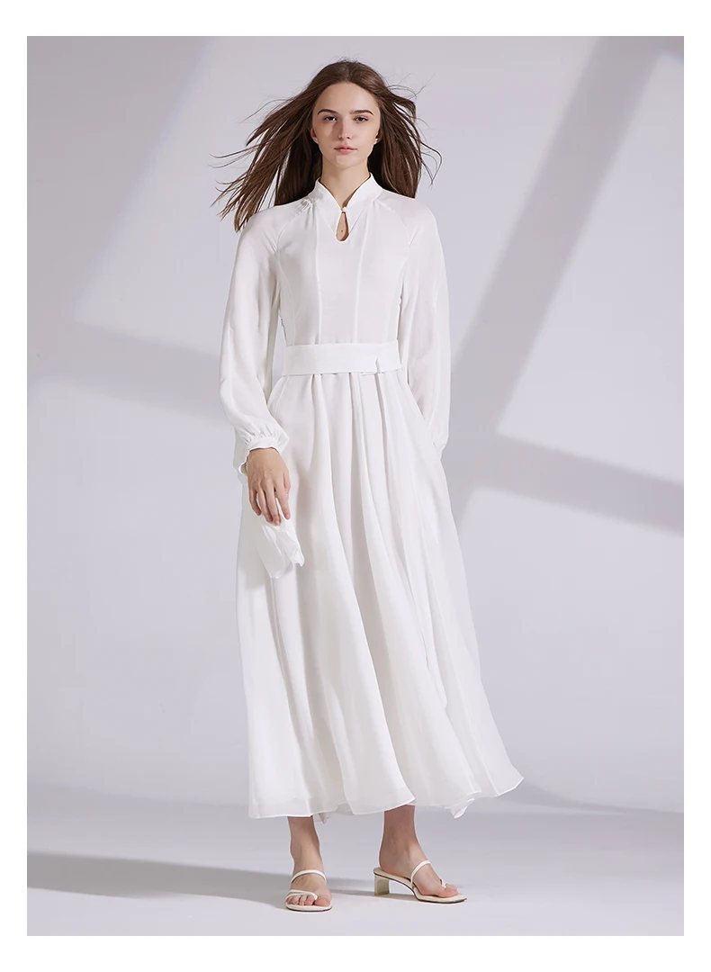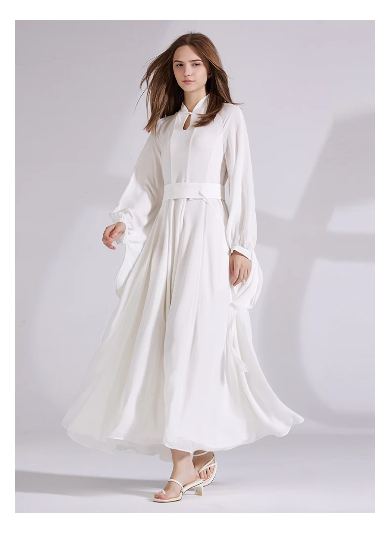VOA silk georgette water drop cheongsam collar light yarn dance waist seal thin Chinese pipa long-sleeved big swing dress