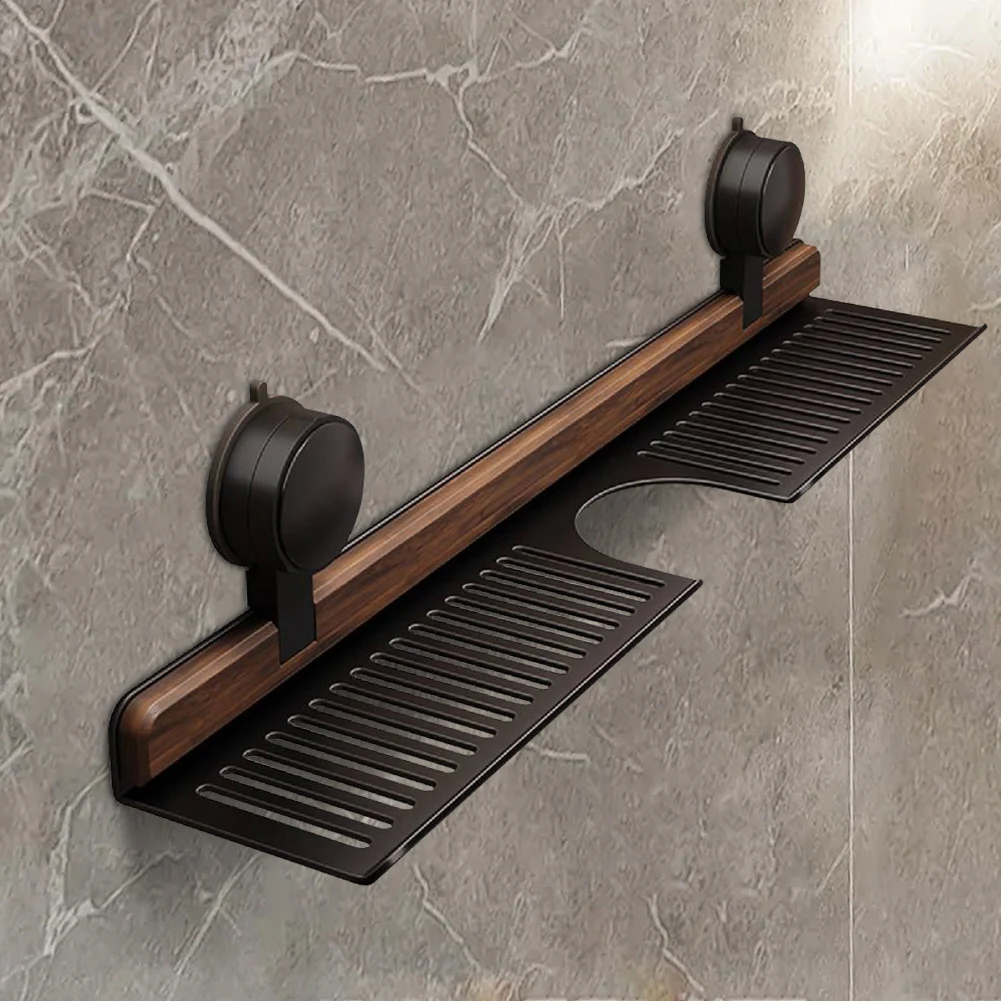 1.Optimized Drainage System: Featuring a wide U-shaped groove and open base, this walnut suction cup bathroom shelf prevents water accumulation, keeping items dry and ensuring secure attachment around any compatible faucet.
