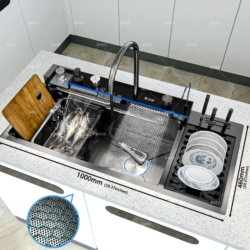 Waterfall Stainless Steel Kitchen Sink Multifunction Digital Display Faucet Wash Dish and Vegetables Basin Large Single Slot