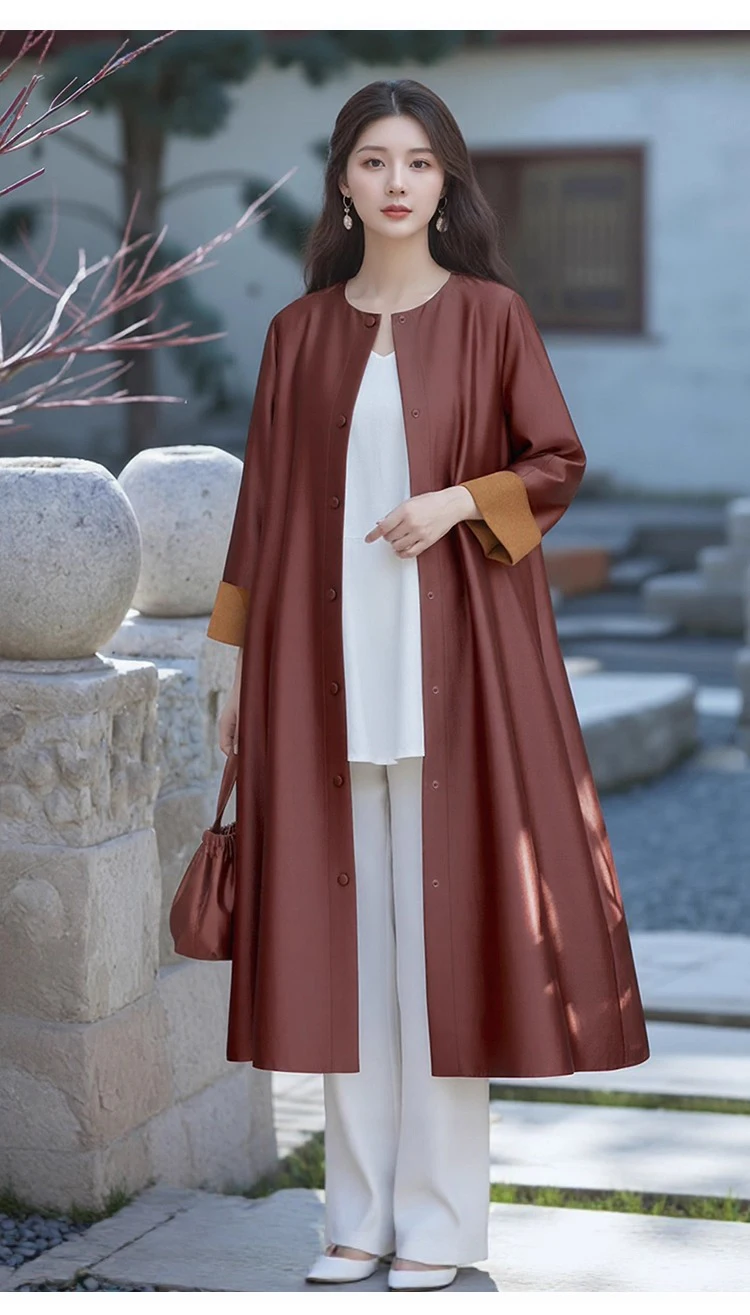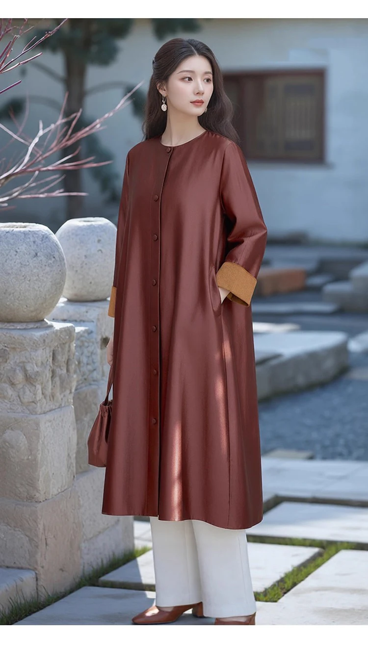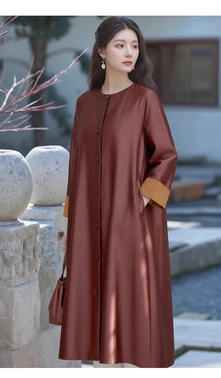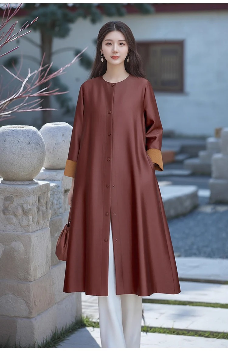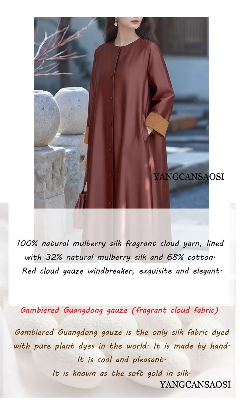 Women’s Fashion Autumn New Clothing 100% Natural Mulberry Silk Red Cloud Yarn Medium Long Jacket Long Sleeved Windbreaker Dress
