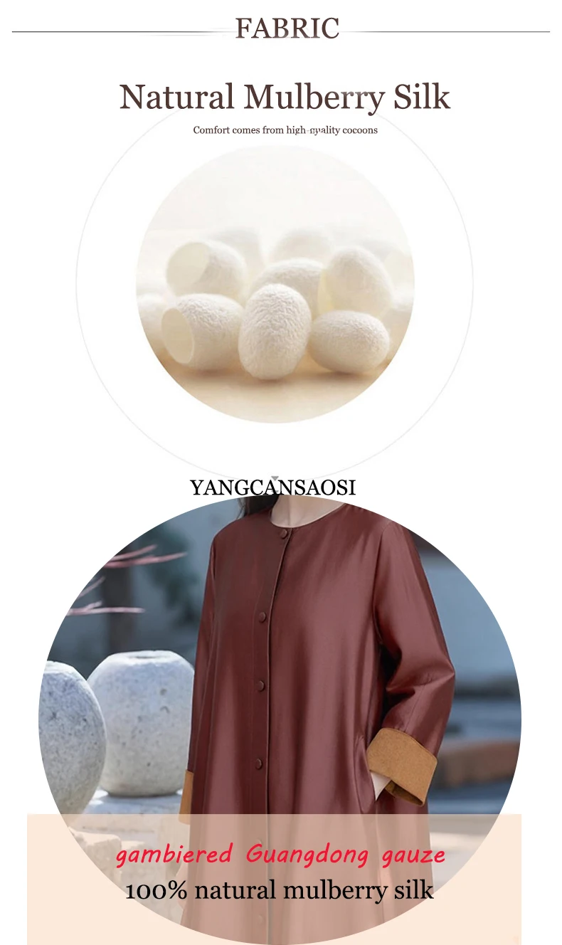 100% natural mulberry silk fragrant cloud yarn, lined with 32% natural mulberry silk and 68% cotton. Red cloud gauze windbreaker, exquisite and elegant.