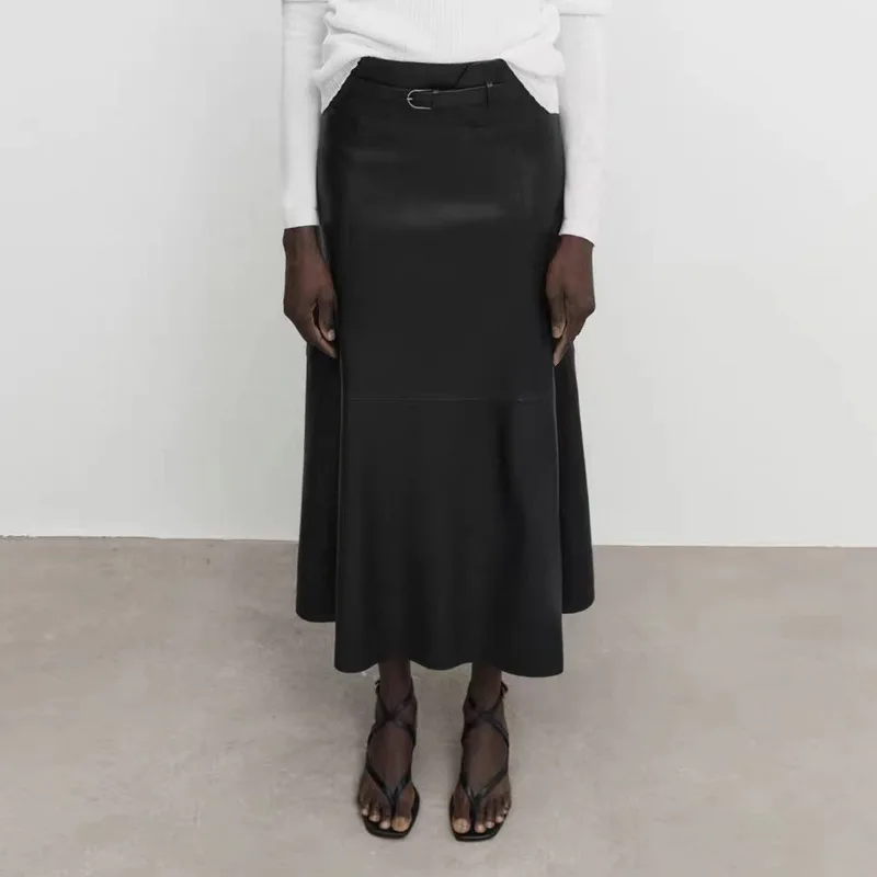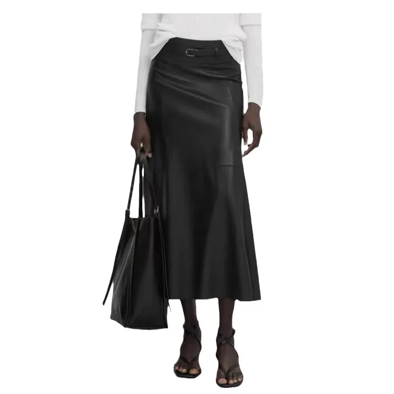 Women’s High Waist Genuine Leather Skirt Versatile Hip Sheepskin Midi Casual Skirt for Spring And Autumn