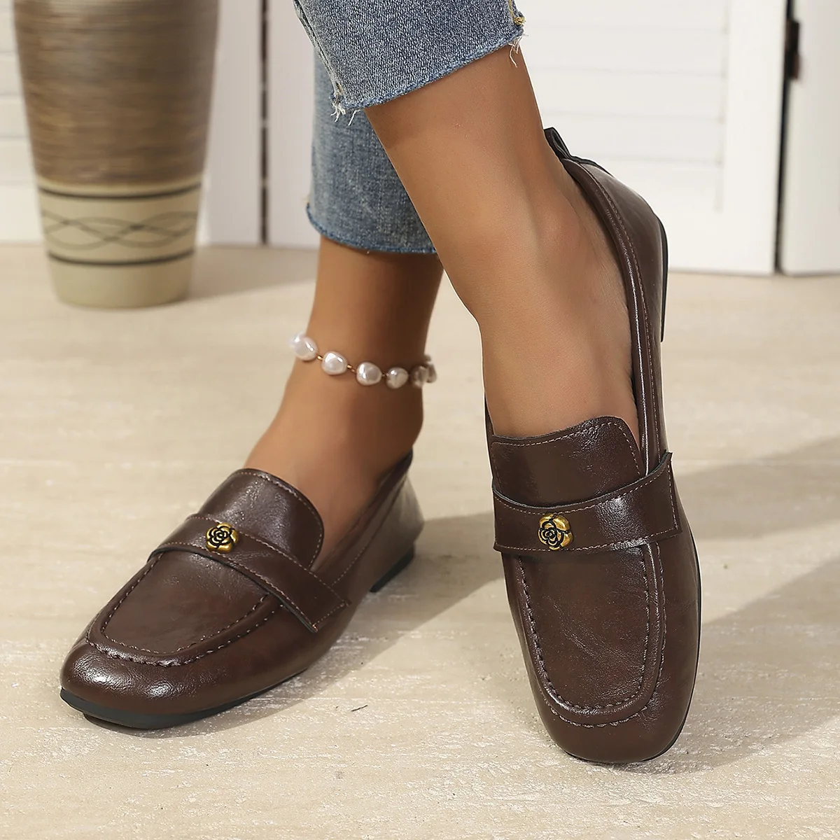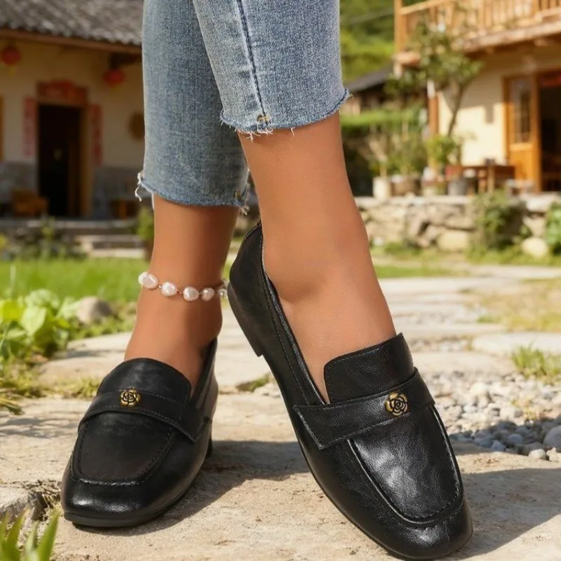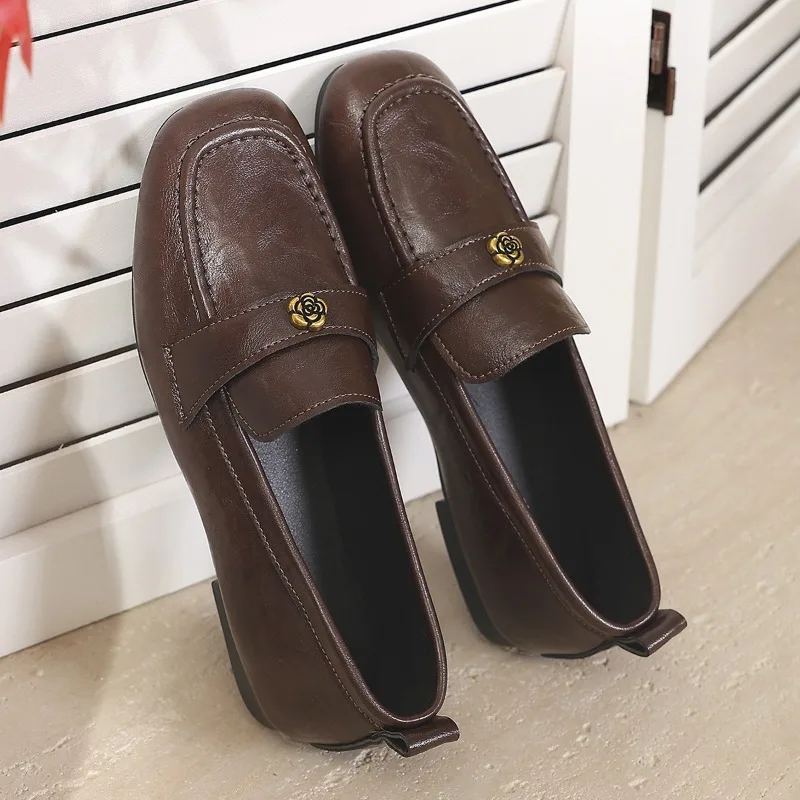 Women’s Leather Flat Loafers with Gold-Tone Flower Accessory Round Apron Toe Low Block Heel Comfortable & Office Dress Shoes