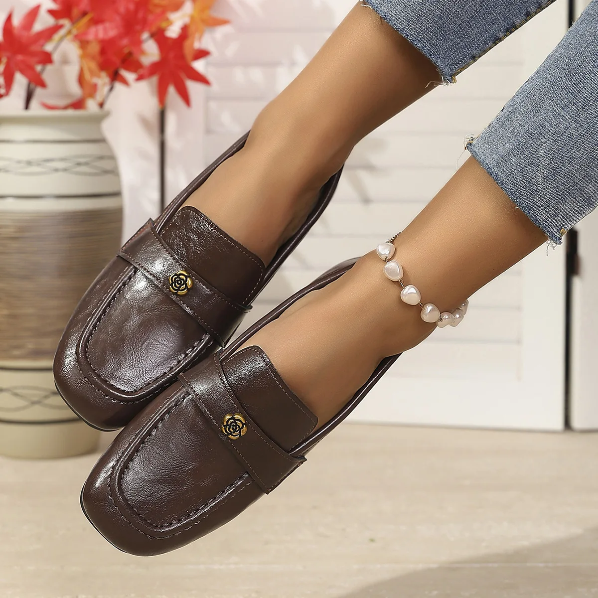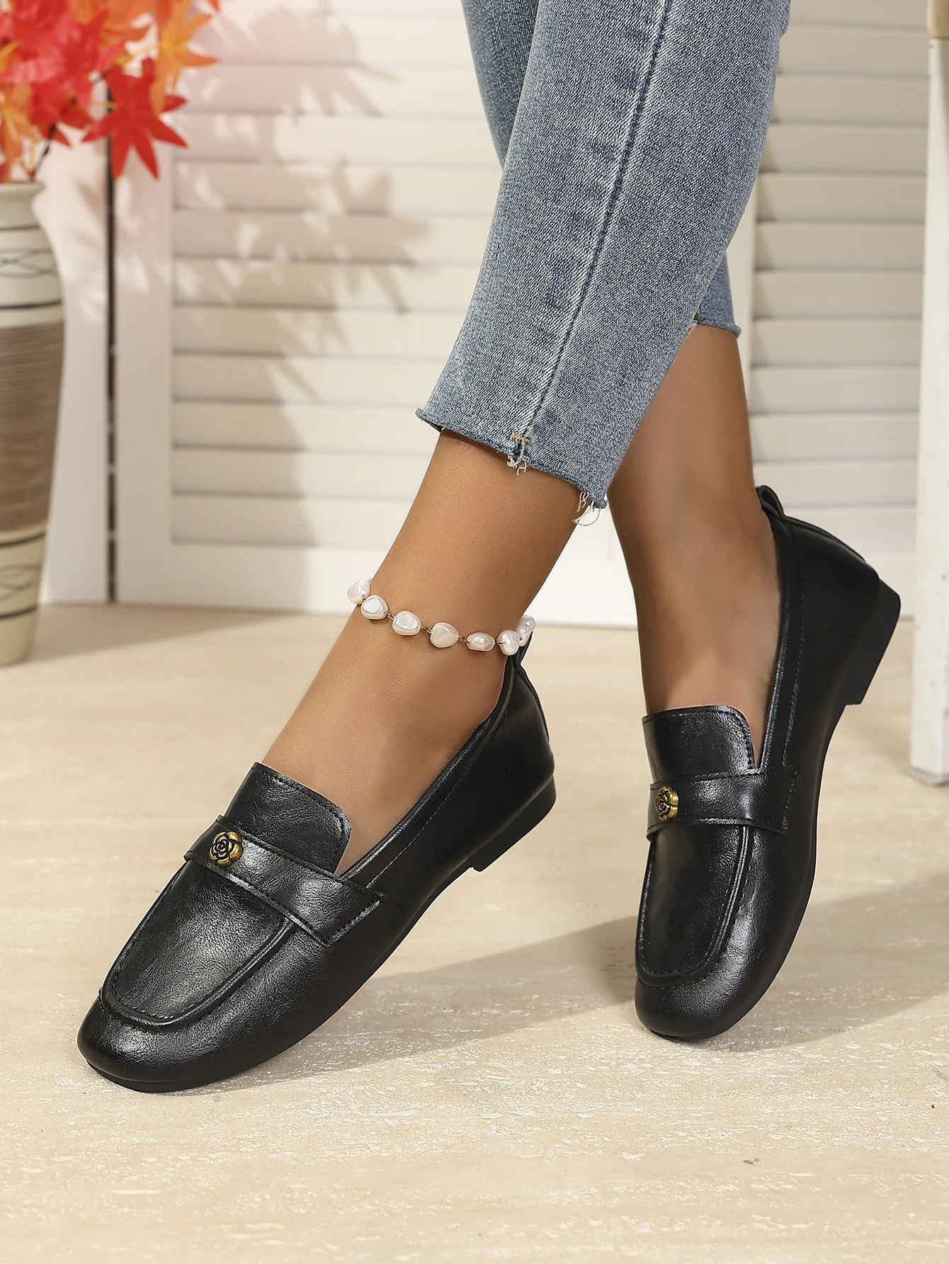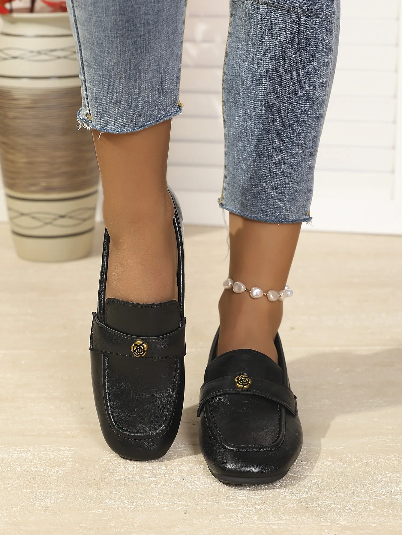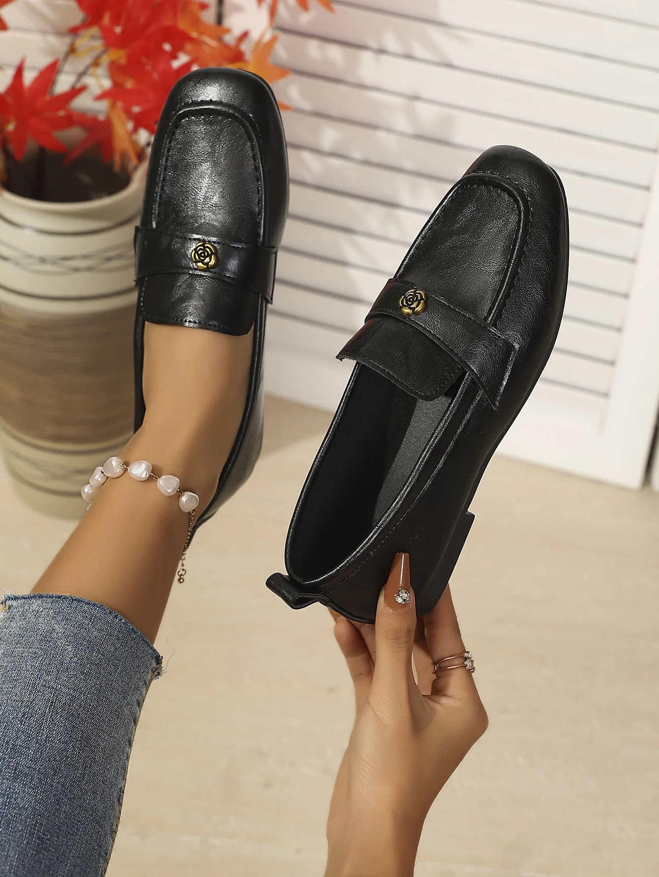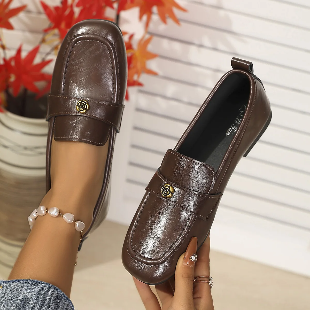 Be the first to review “Women’s Leather Flat Loafers with Gold-Tone Flower Accessory Round Apron Toe Low Block Heel Comfortable & Office Dress Shoes”