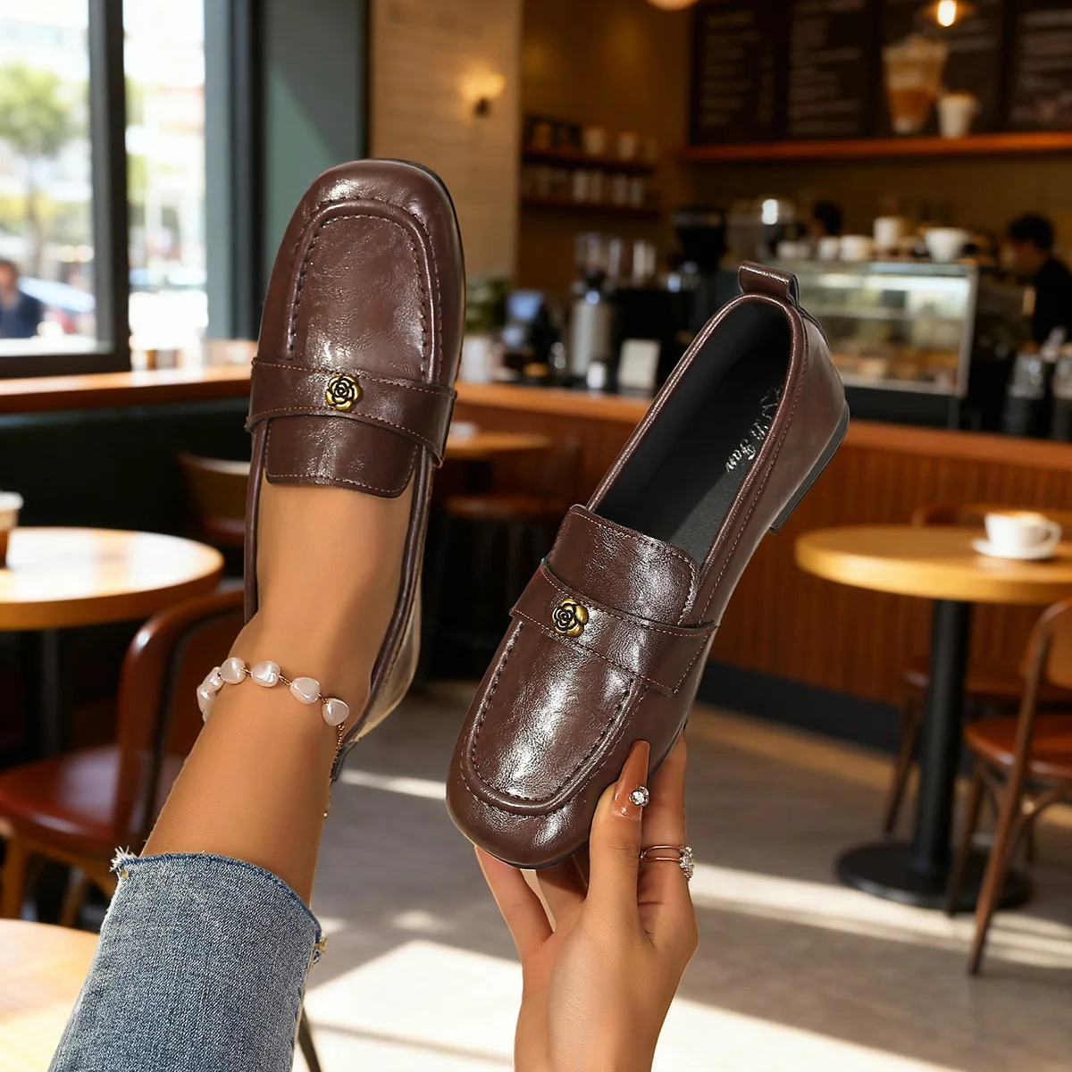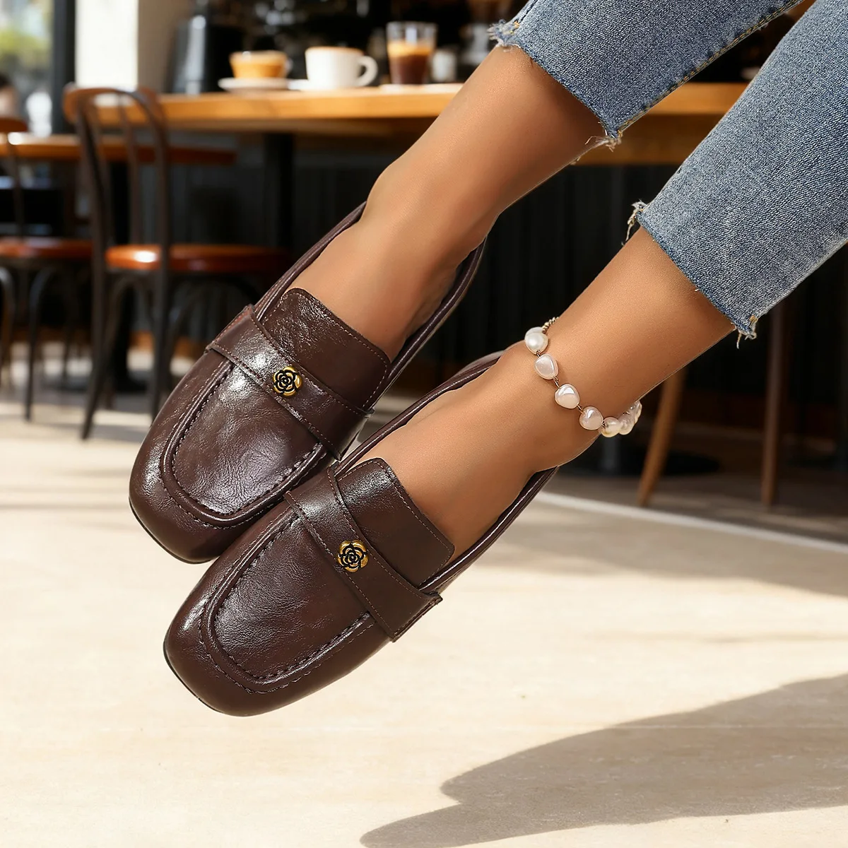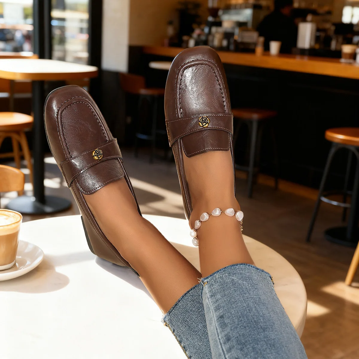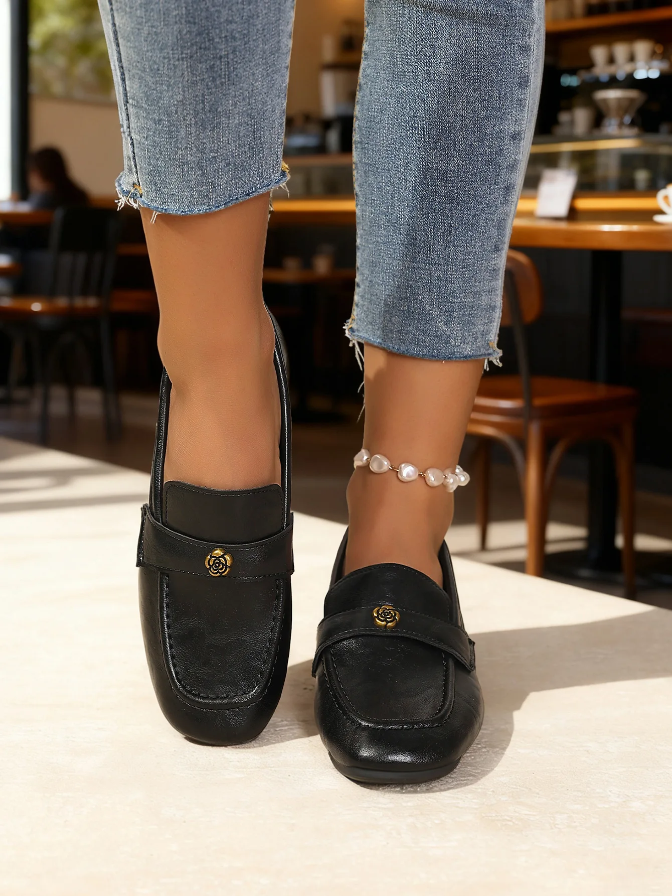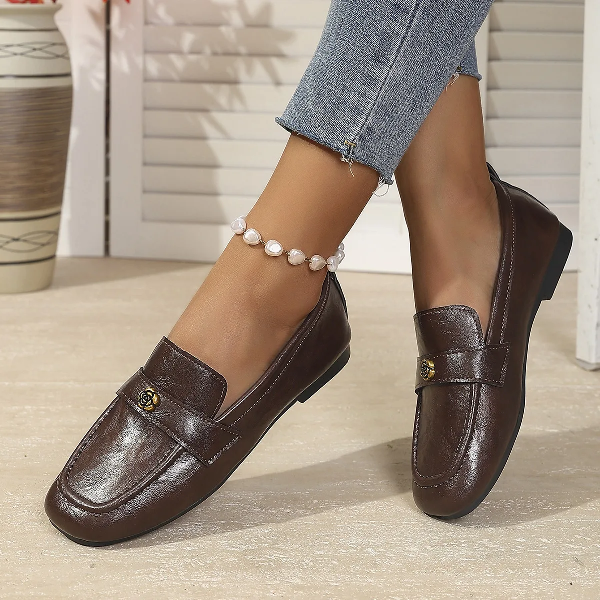Be the first to review “Women’s Leather Flat Loafers with Gold-Tone Flower Accessory Round Apron Toe Low Block Heel Comfortable & Office Dress Shoes”