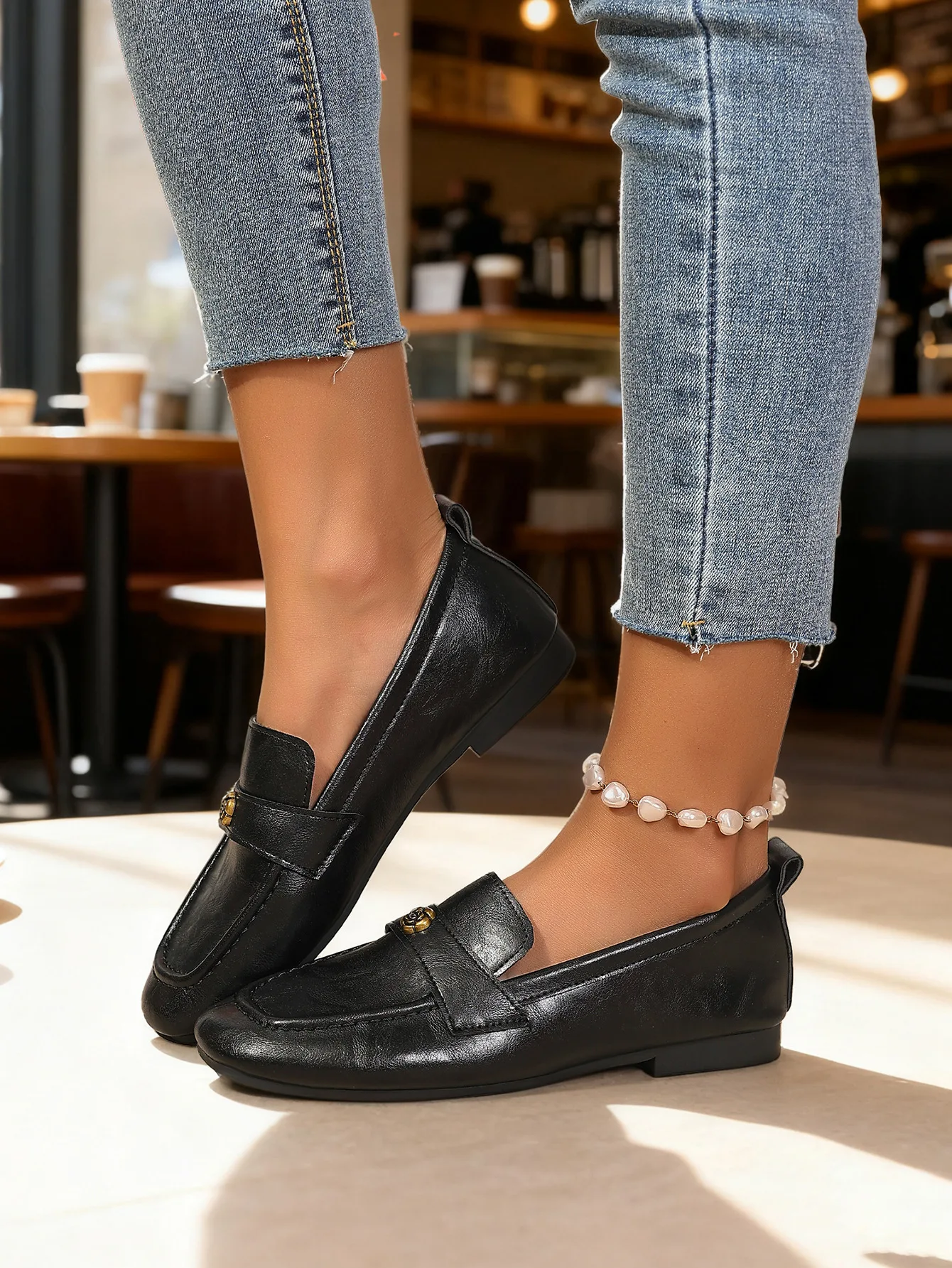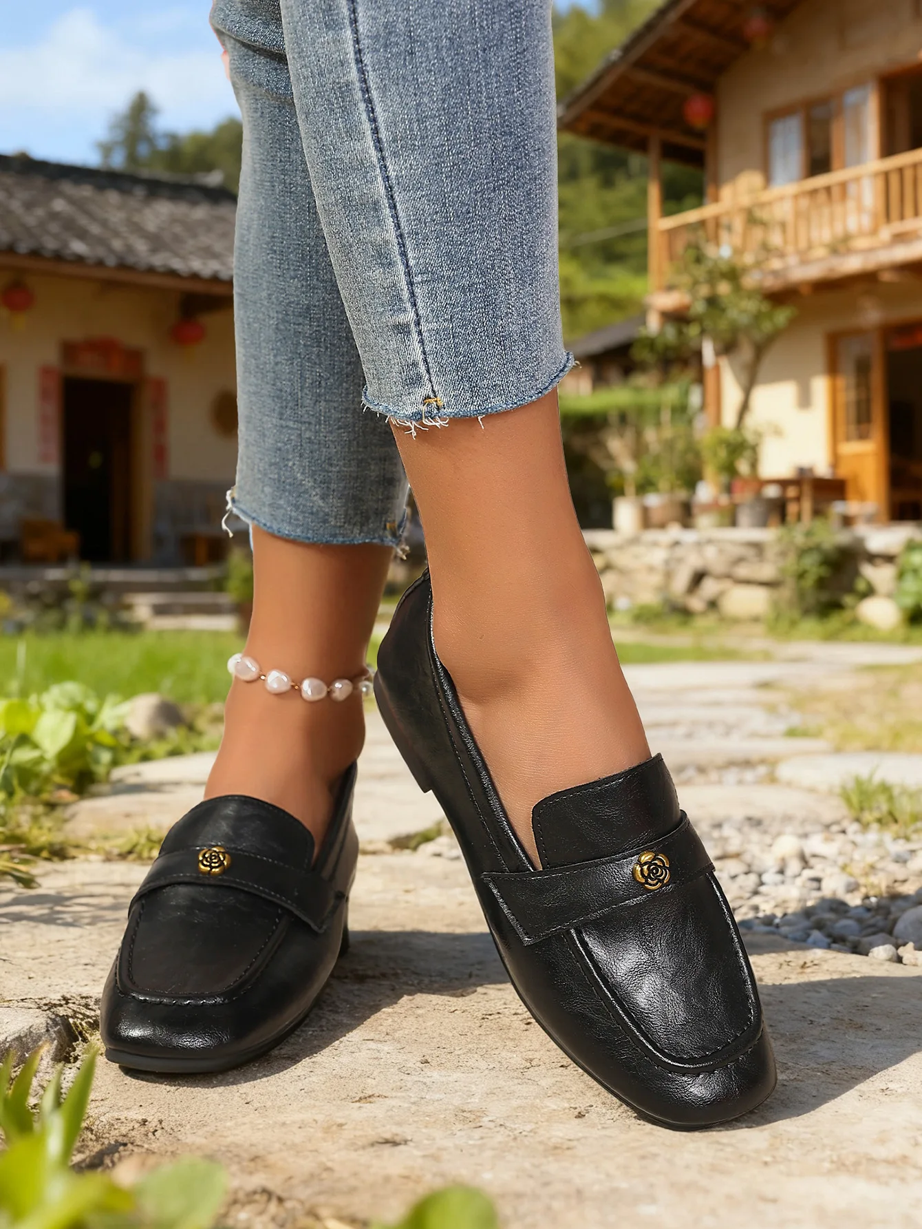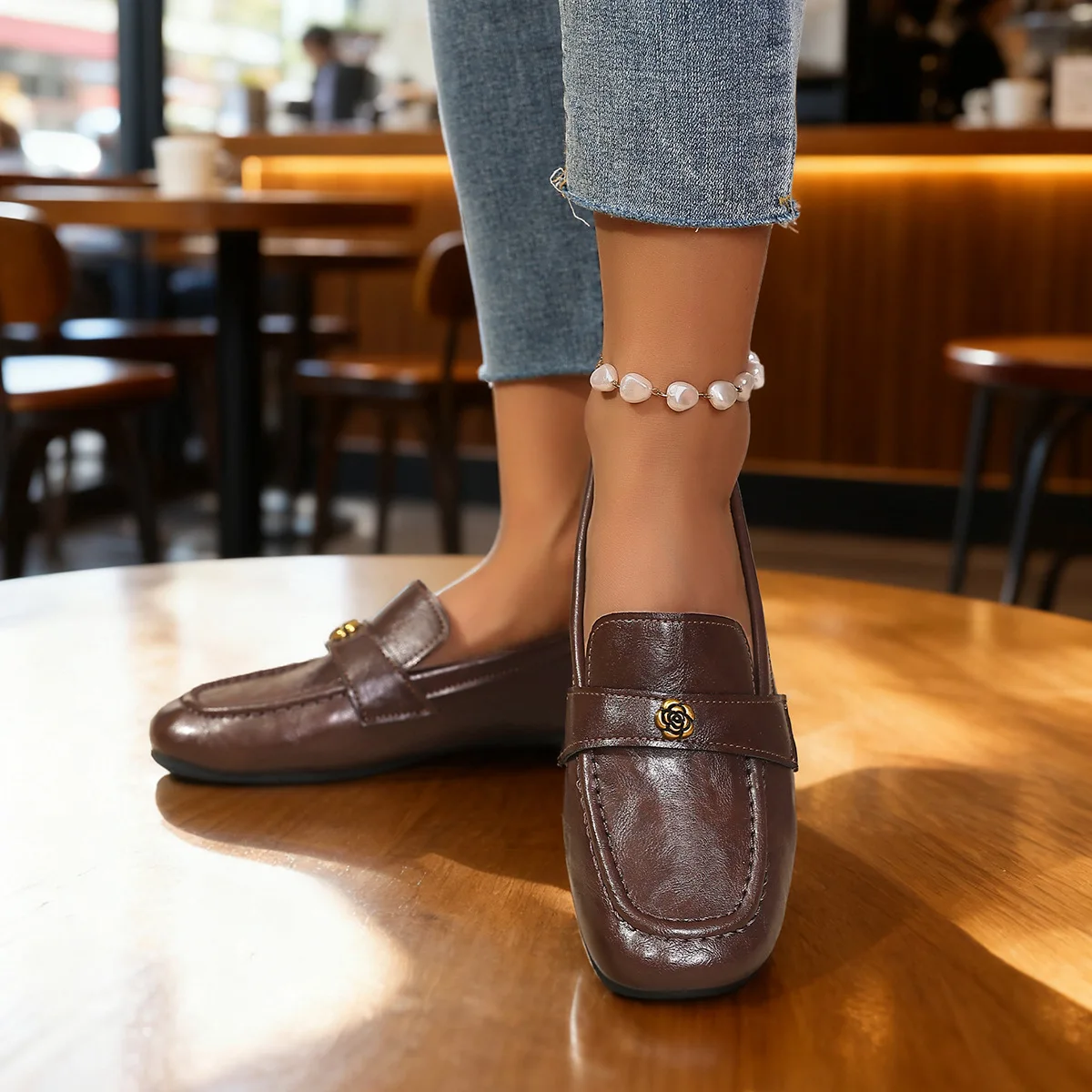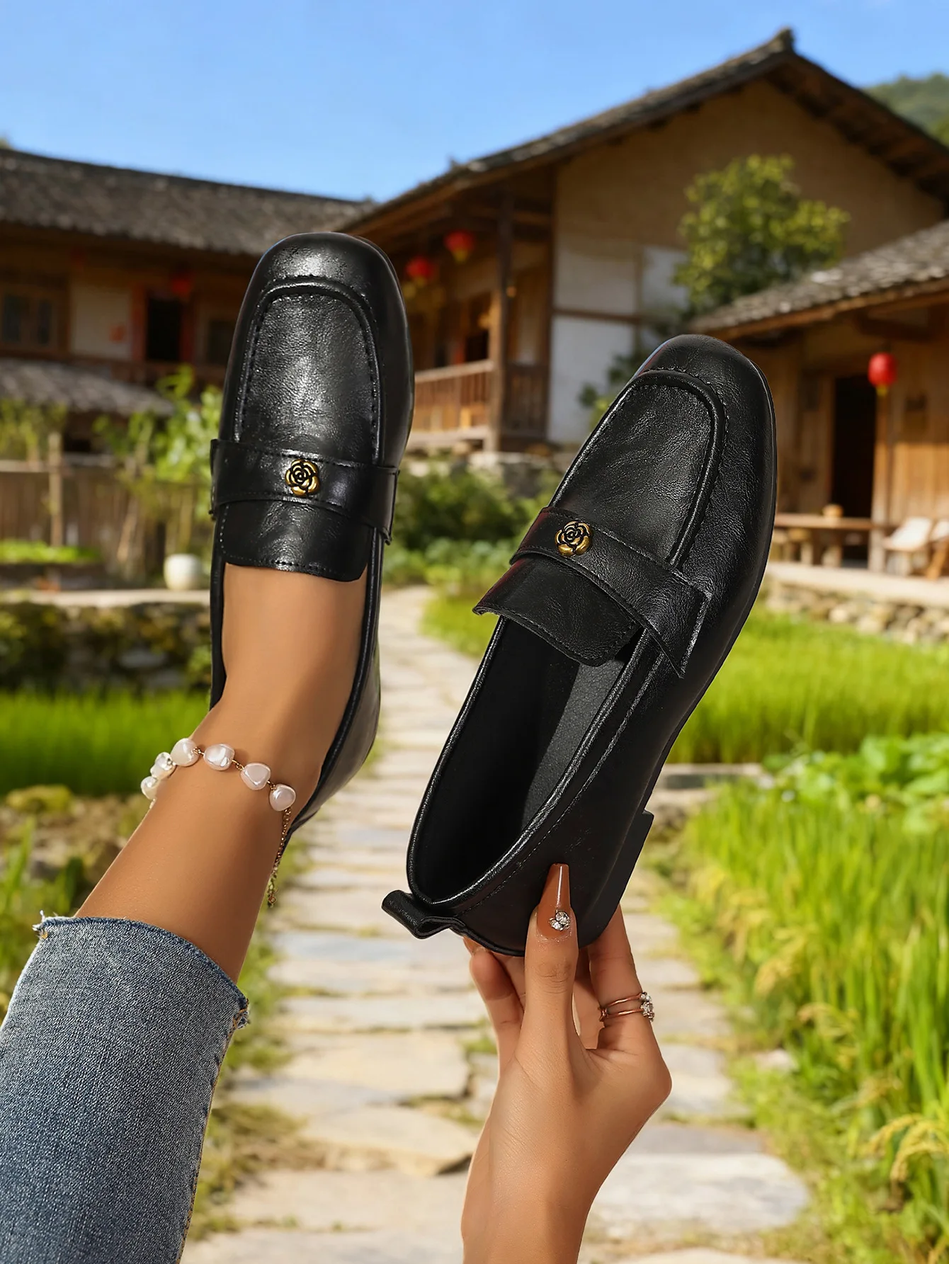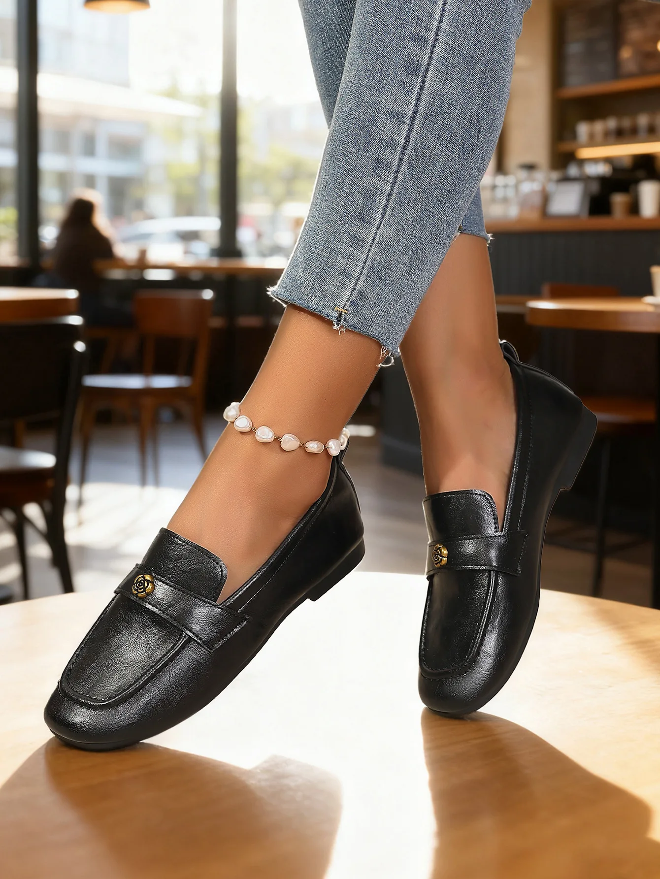 Be the first to review “Women’s Leather Flat Loafers with Gold-Tone Flower Accessory Round Apron Toe Low Block Heel Comfortable & Office Dress Shoes”
