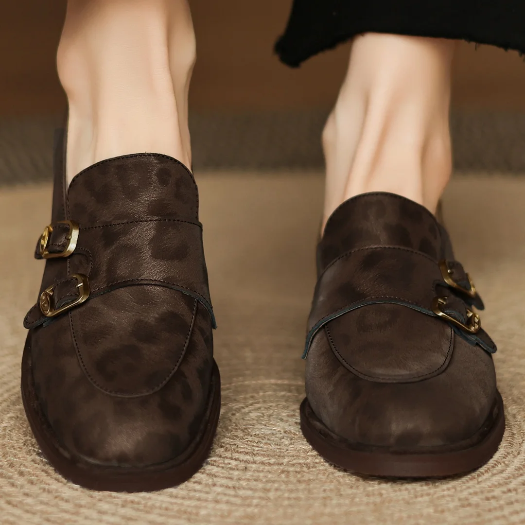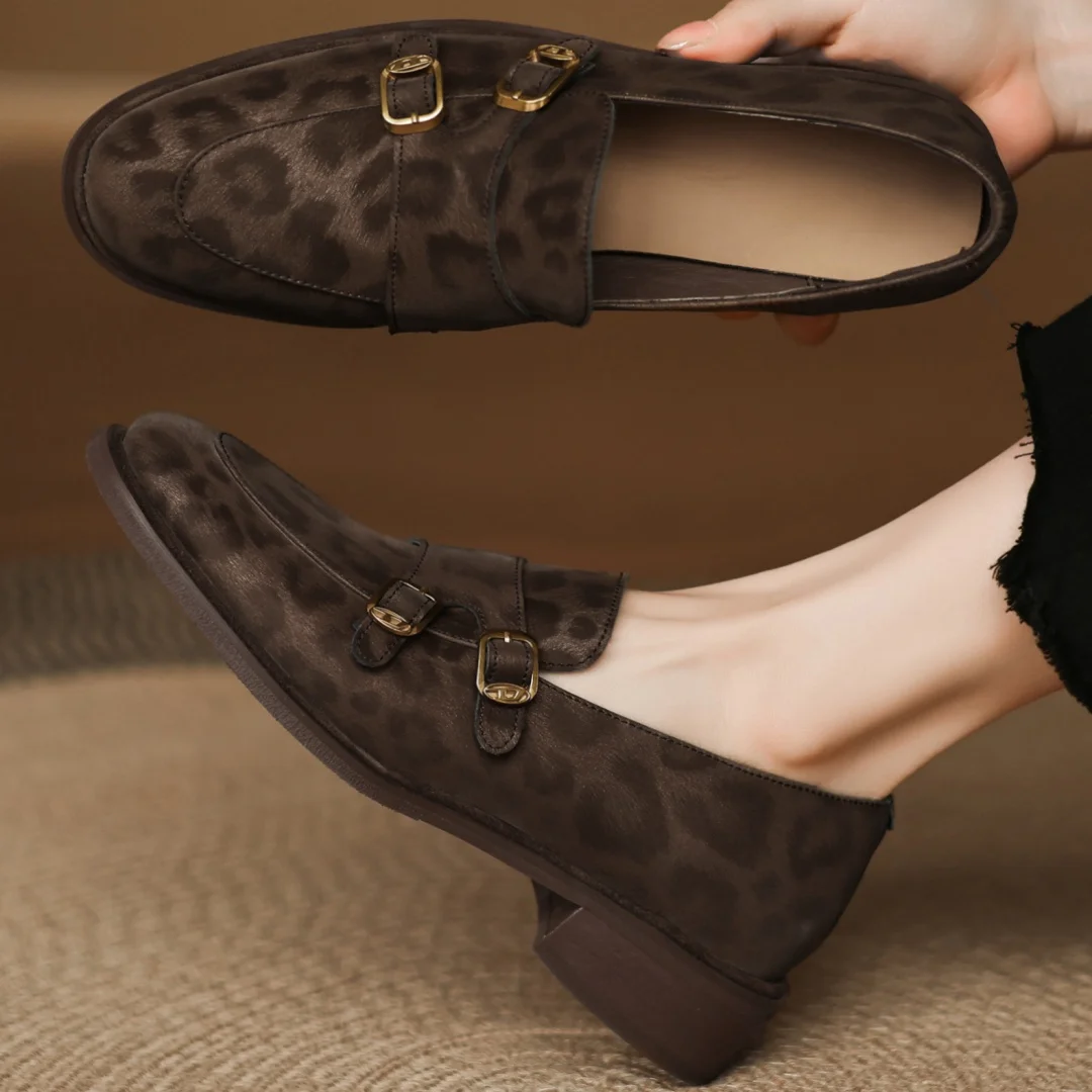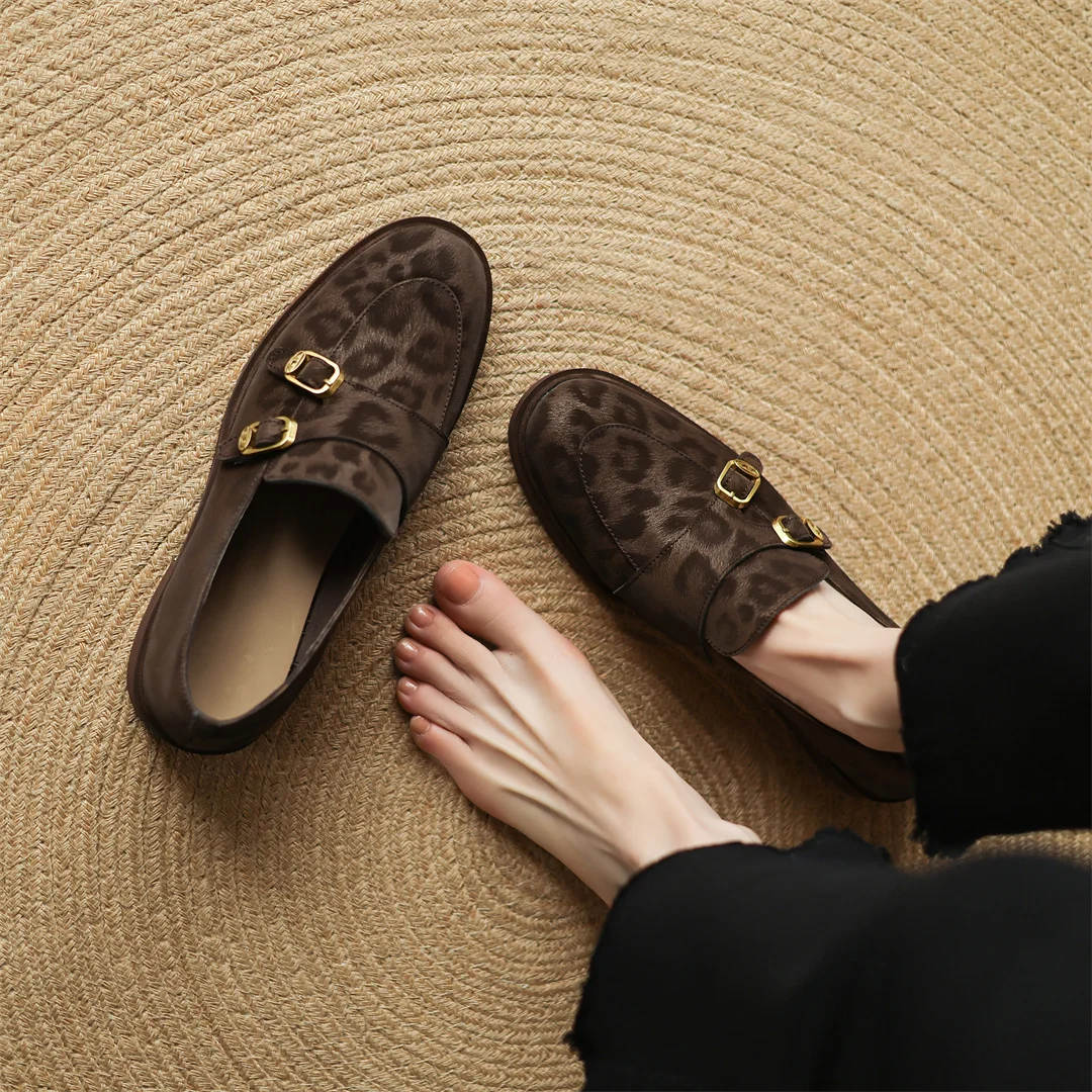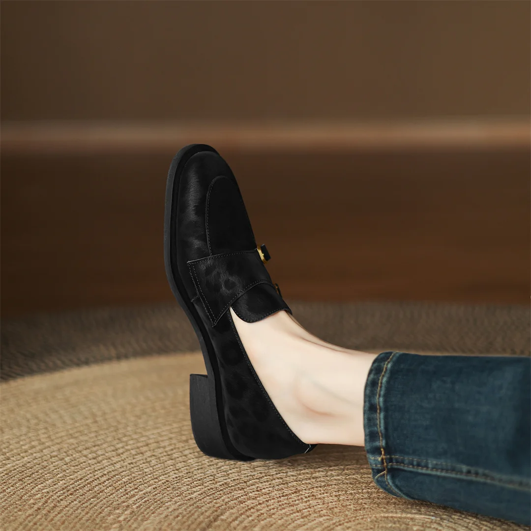 Women’s leopard cow leather metal buckle round toe slip-on flats loafers round toe soft comfortable casual female moccasins shoe