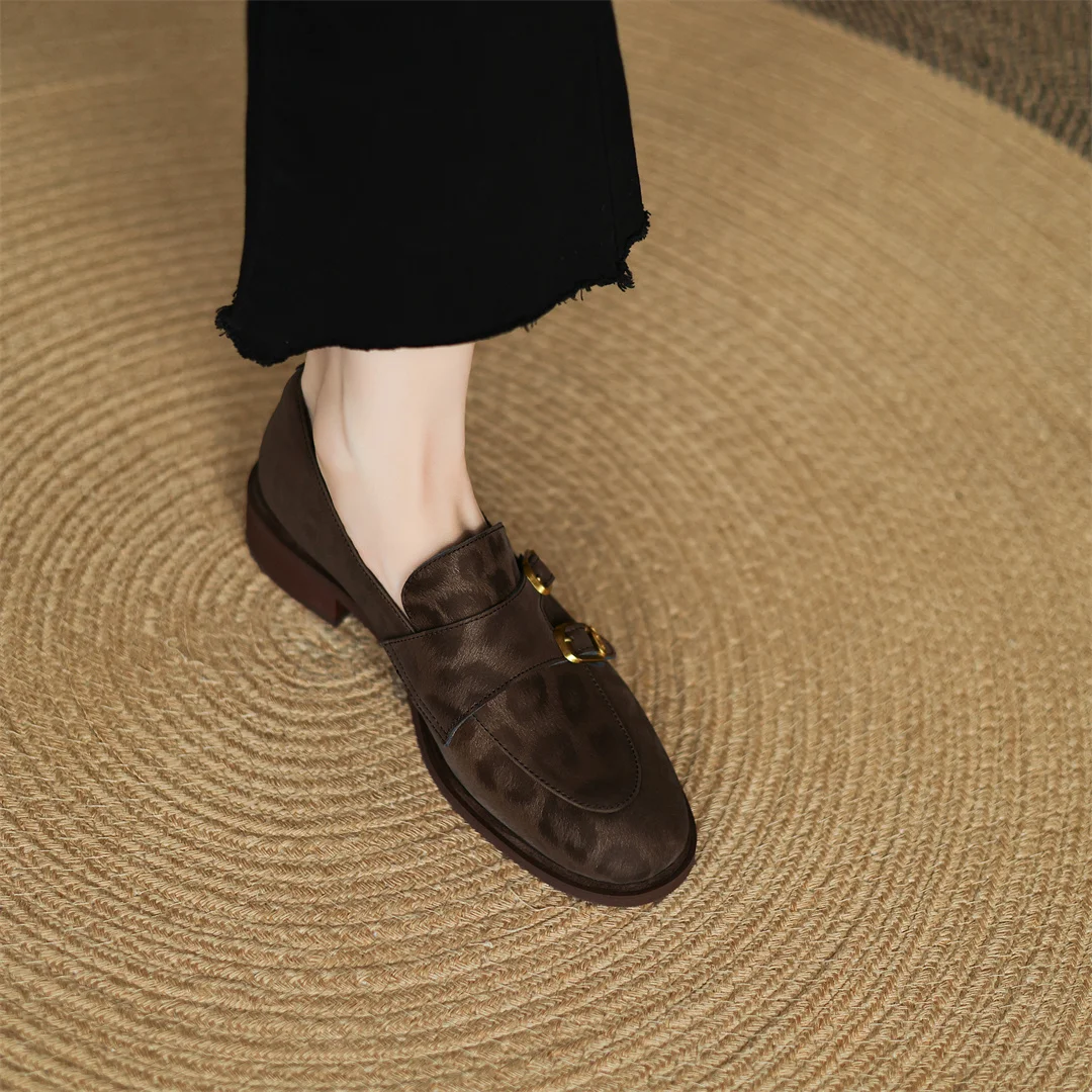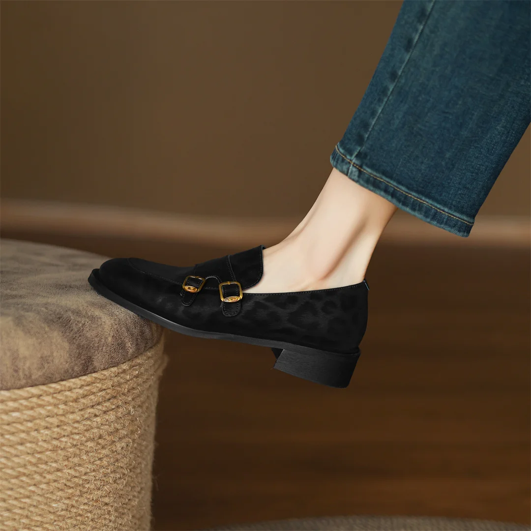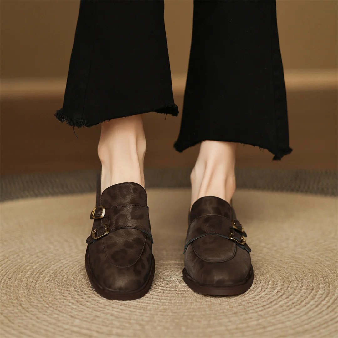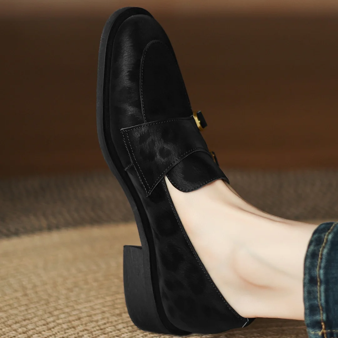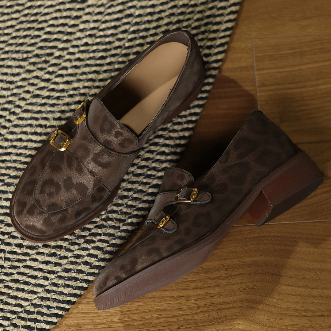 Women’s leopard cow leather metal buckle round toe slip-on flats loafers round toe soft comfortable casual female moccasins shoe
