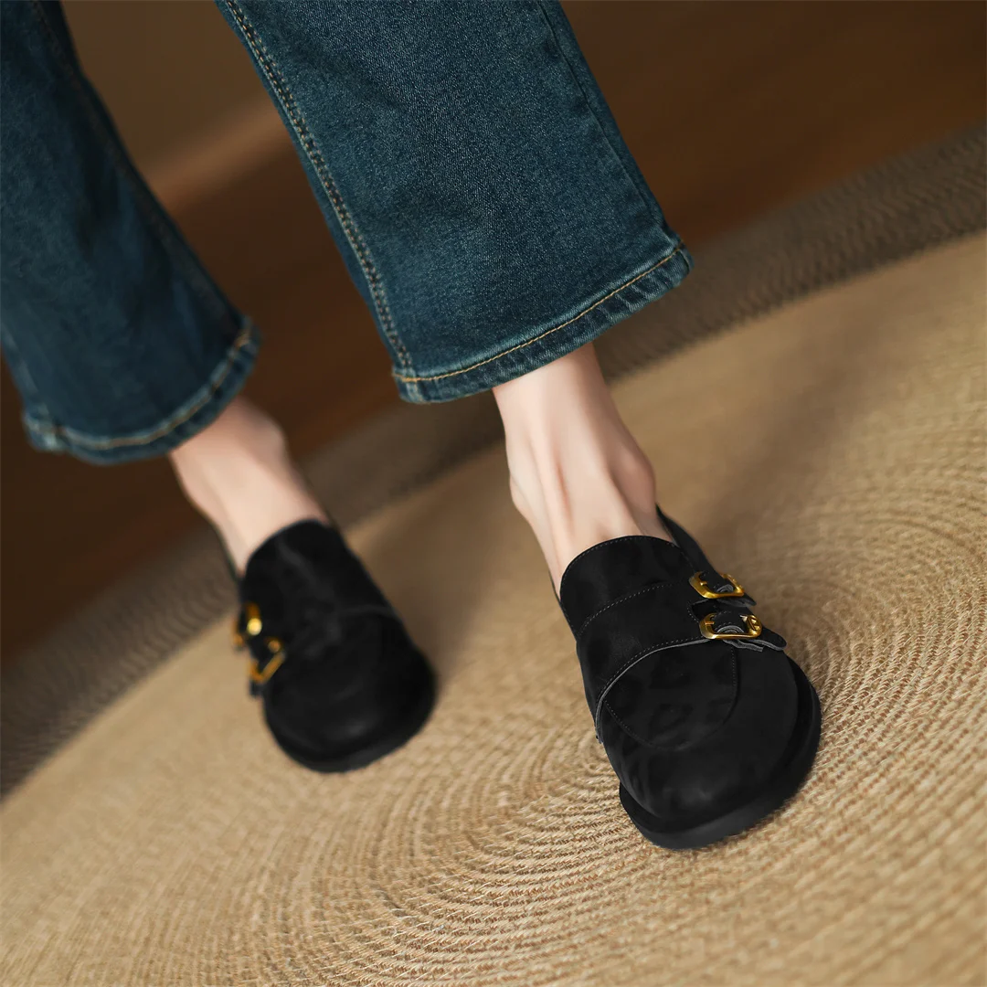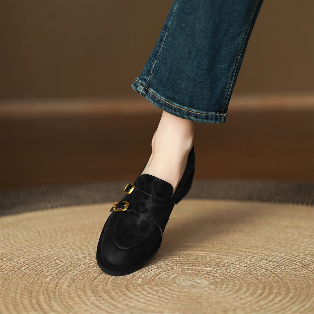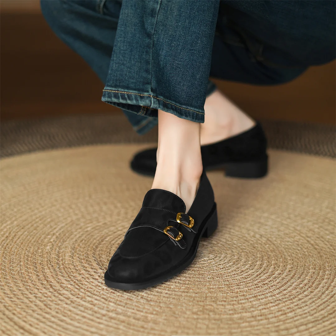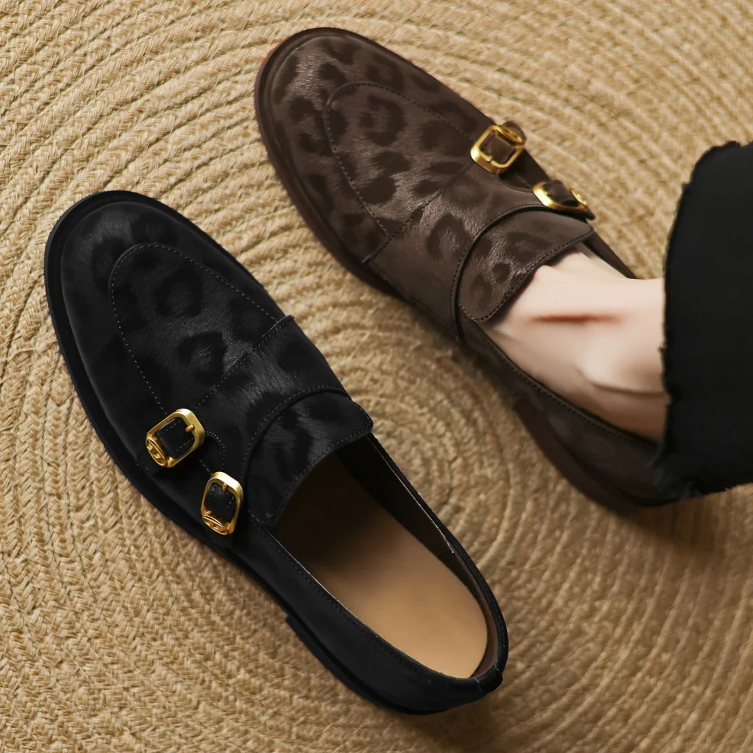 Women’s leopard cow leather metal buckle round toe slip-on flats loafers round toe soft comfortable casual female moccasins shoe