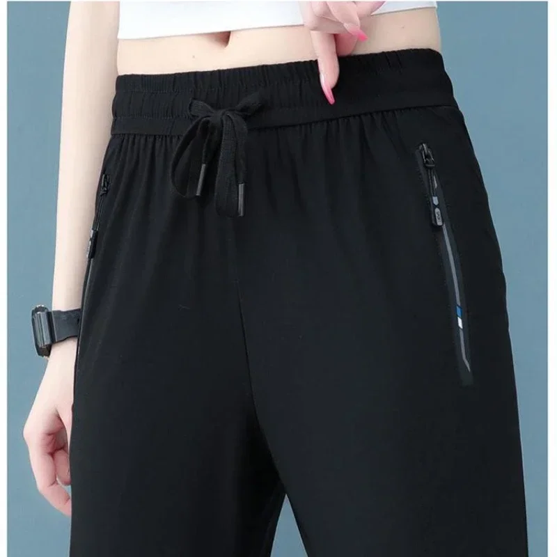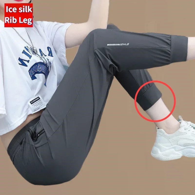 Women’s Spring Summer Thin Ice Silk Pants Comfortable Breathable Casual Elastic Beam Feet Pants Slim Sports Fitness Trousers
