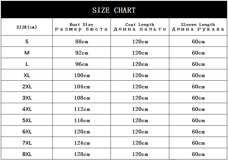 2.it's winter coat, so usually we will advice customer choose size little bigger 4-6 cm than bust size ,so you can wear clothes inside