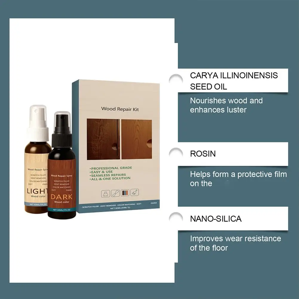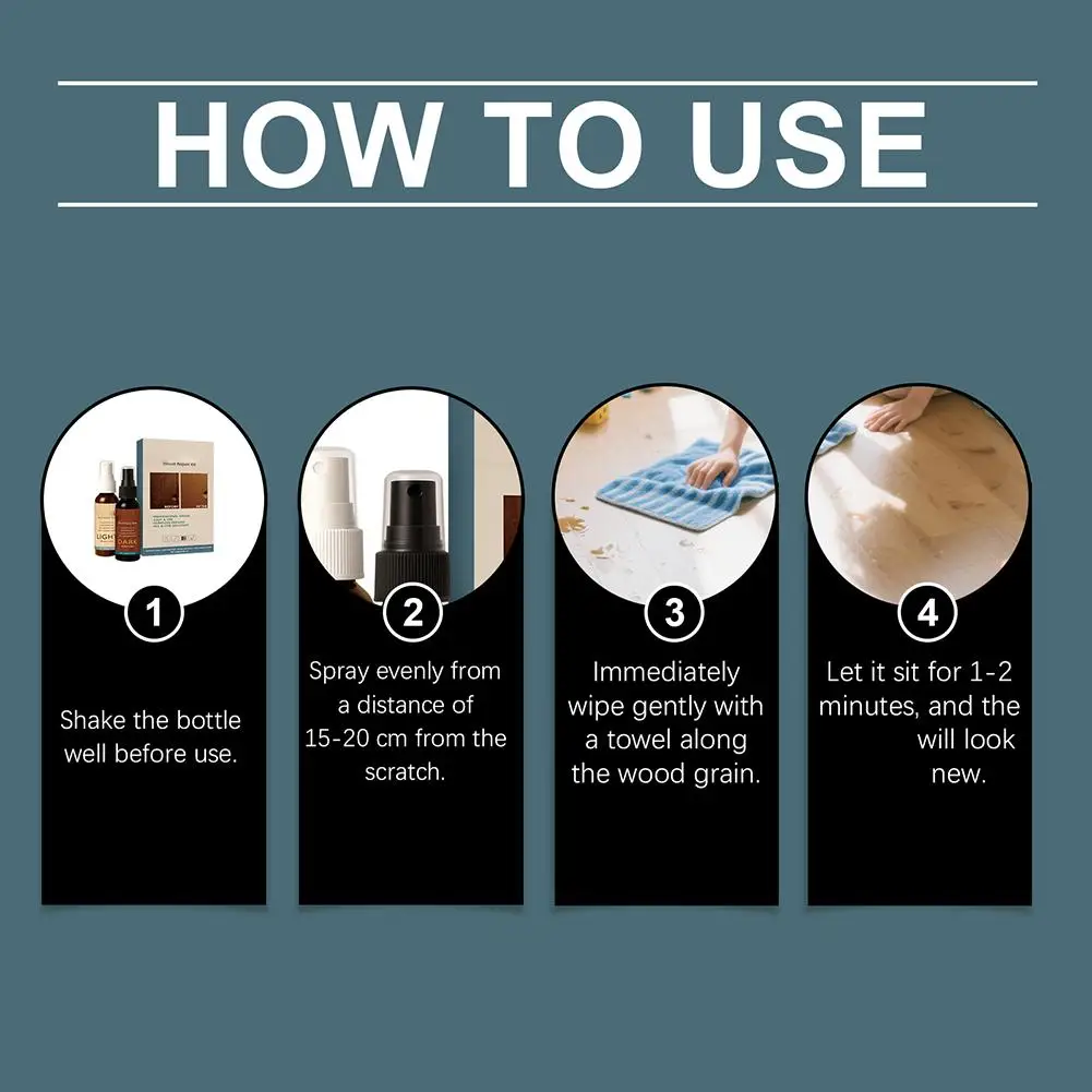 Product Details: Our wood floor care spray is carefully formulated with rosin and nano silica. It is specially designed to nourish wood and enhance its shine. Extremely easy to use: Shake the bottle well before use. Spray evenly from a distance of 15-20cm from the scratch. Immediately wipe gently along the wood grain with a towel, let it sit for 1-2 minutes, and the forsurface will look forbrand new. Visible improvement can be seen in a short time.