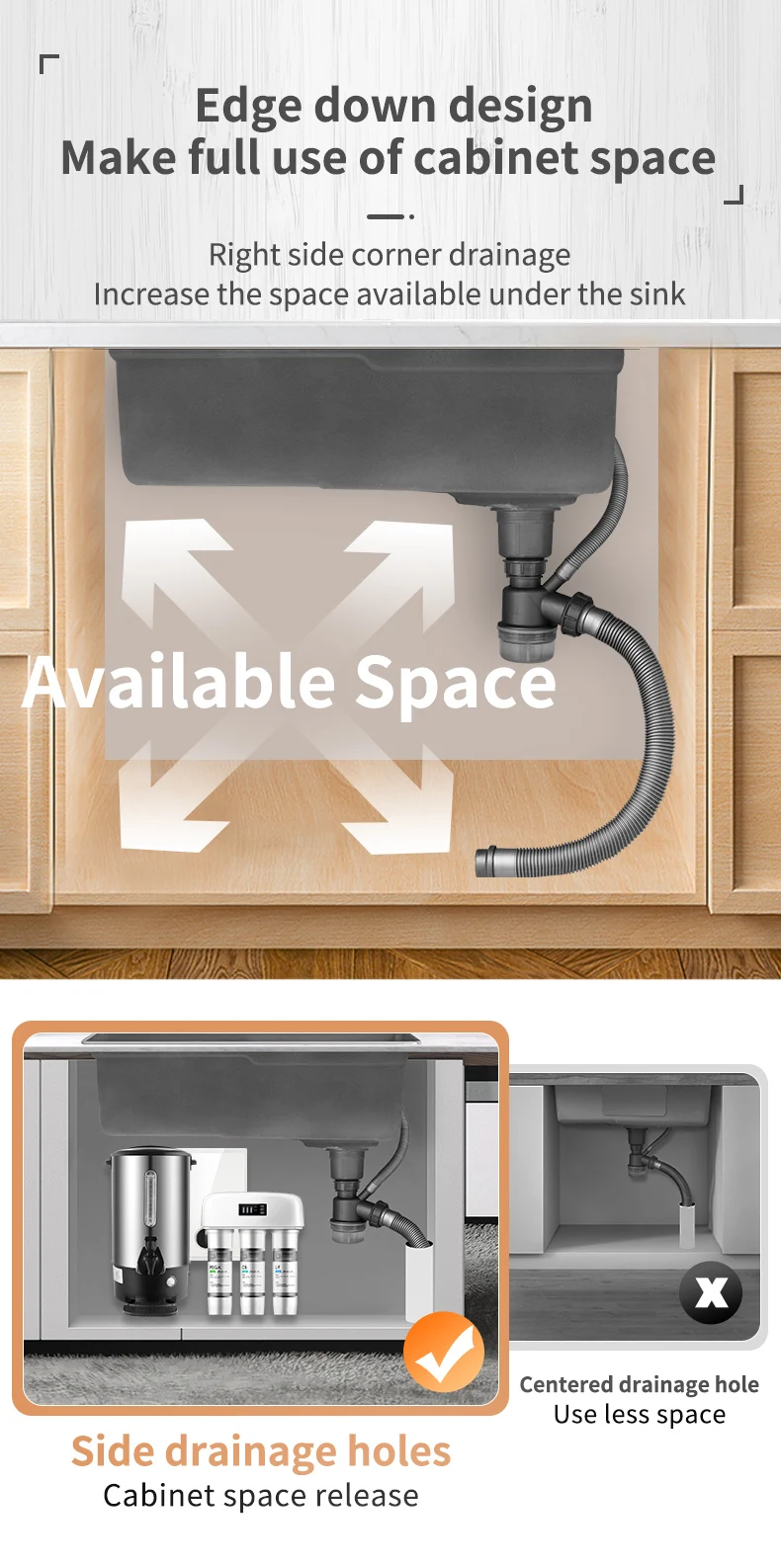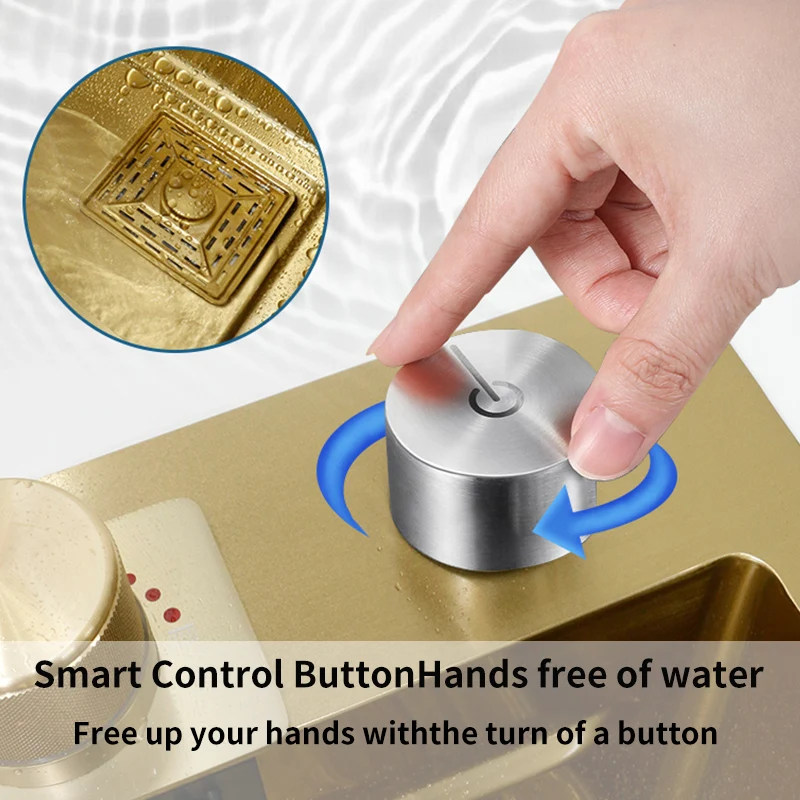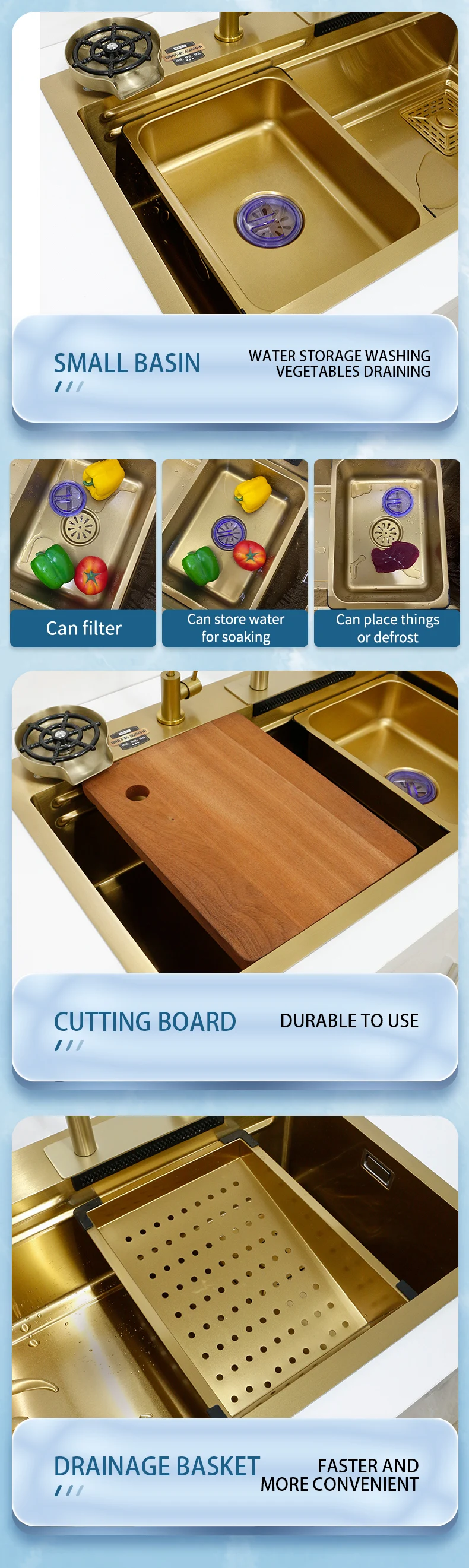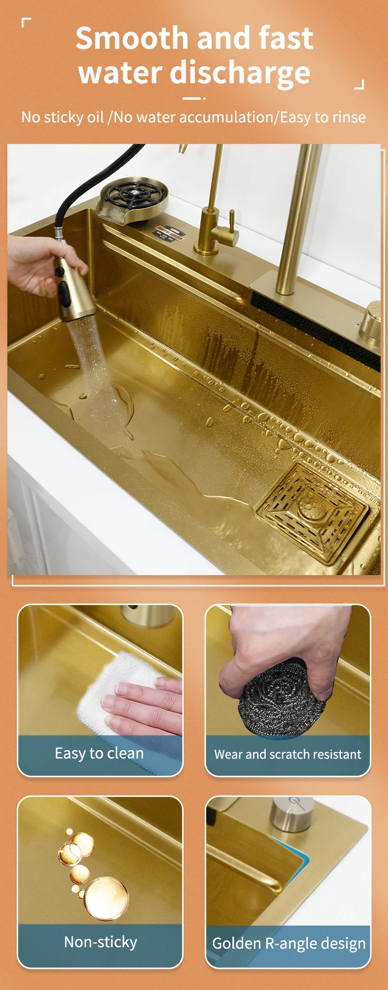 YCRAYS Golden Nano Multifunctional Kitchen Sink 4 Mode Waterfall Faucet Large Single Bowl Soap Dispenser Pure Tap Cup Washer