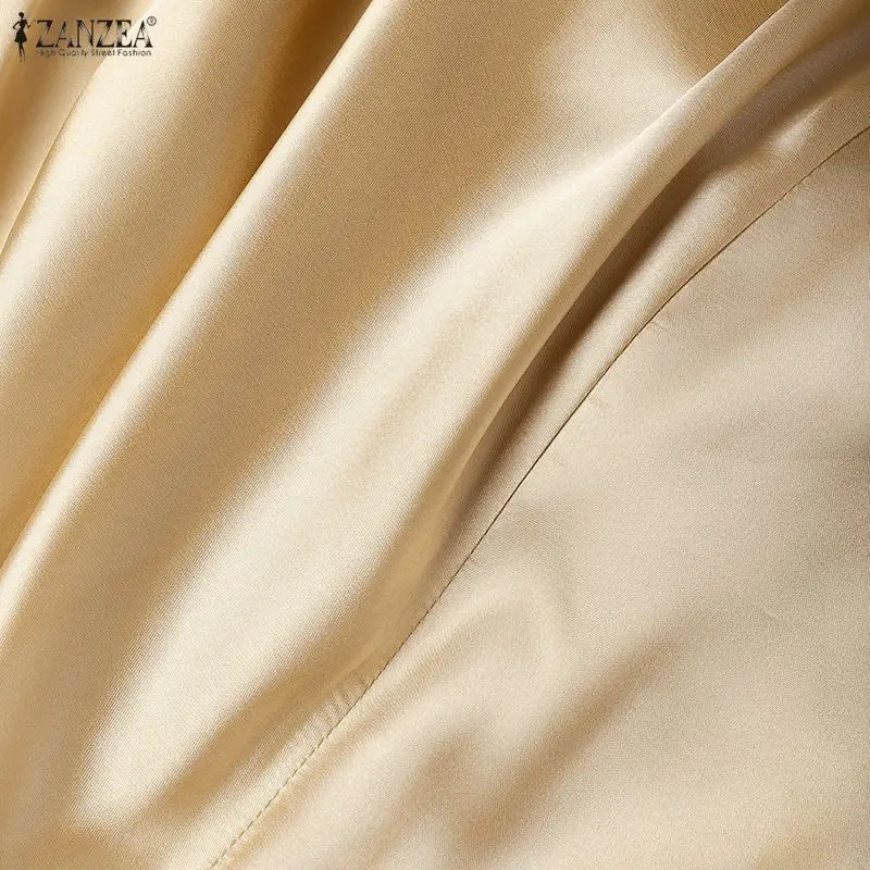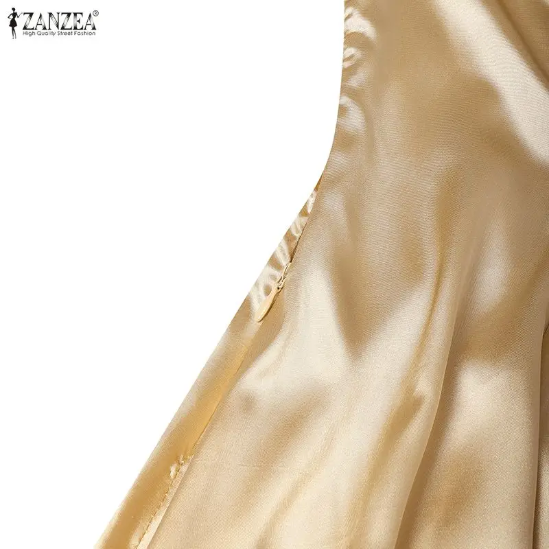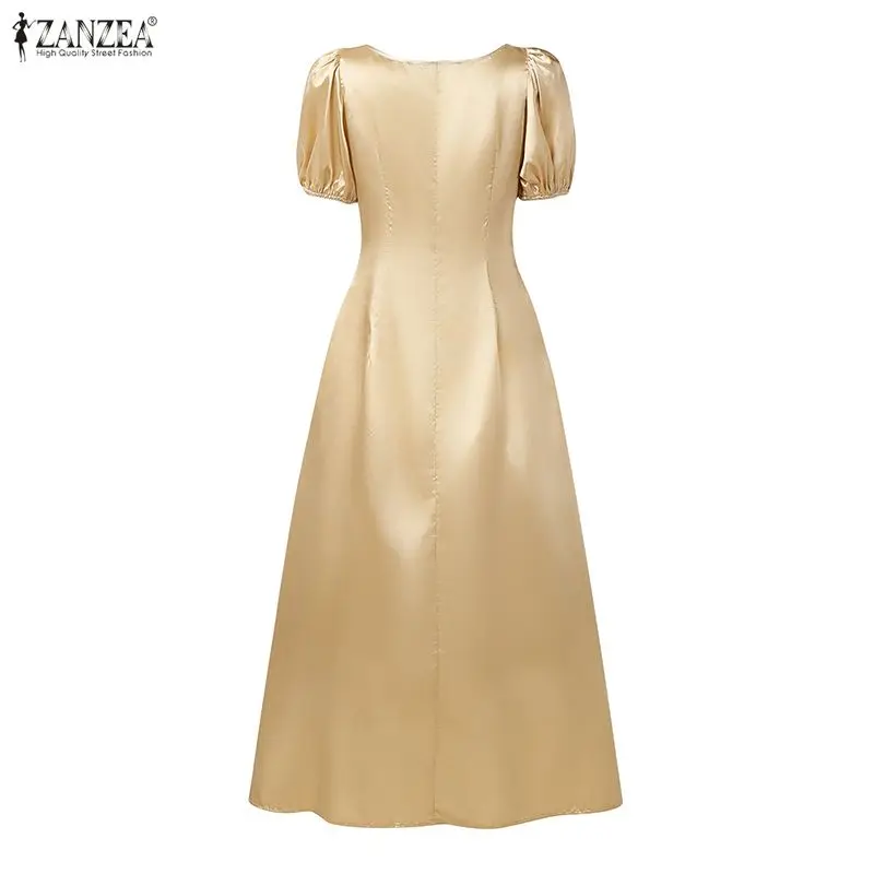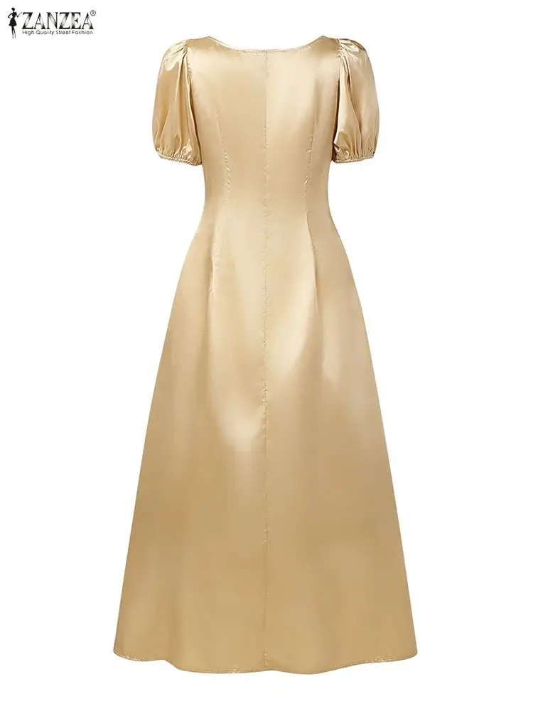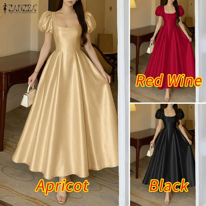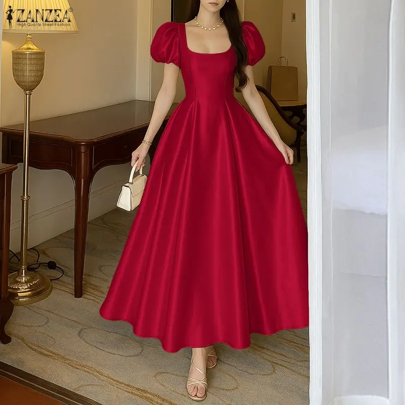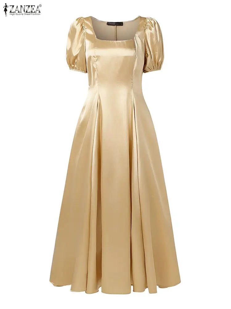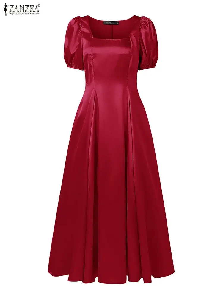 ZANZEA Women Satin Wedding Guest Party Long Dresses Elegant Chic Square Neck Short Puff Sleeve Fitted Waist A-Line Dress S-3XL