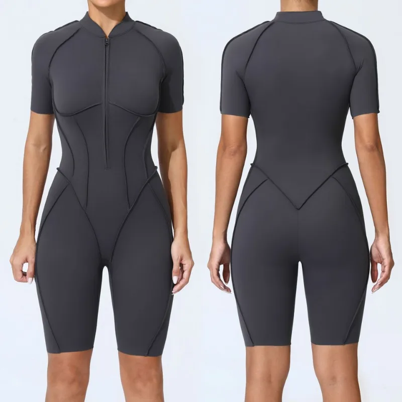 Zipper Short-sleeved Yoga Sports Fitness Jumpsuits Sets Without Chest Pad Tight Bodysuits Shorts Gym Workout Clothes for Women